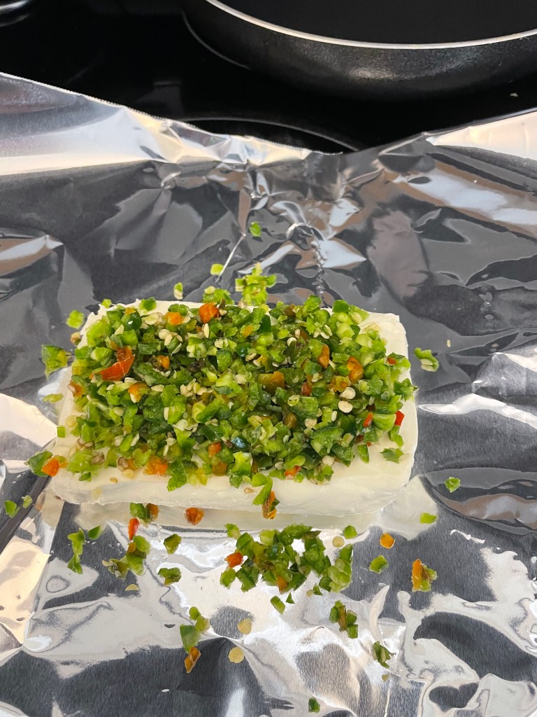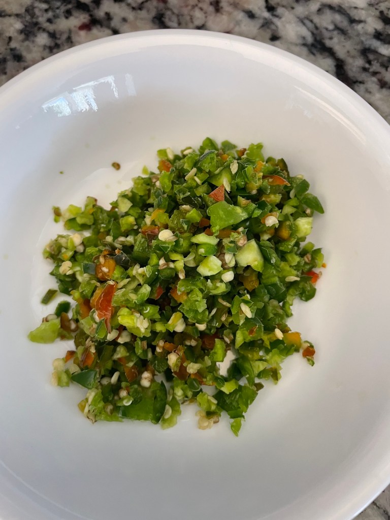 A few days after catching it, I had time to prepare the fish dip. I put the fillets in a brine for a few hours as I got everything else ready. I picked some jalapeños from my garden and diced them up to put them on the cream cheese.