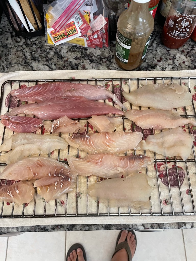 I have been told Jack Crevalle makes a good fish dip, so I decided to keep one and try it out. When I caught a decent size Jack, about 20 inches, I bleed it out and then put it in an ice slurry. I filleted it up and cut out the blood line and brought it home.