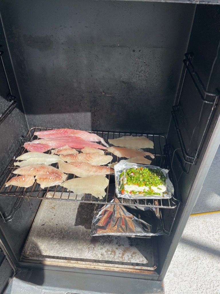 Once the smoker was ready, I put in the fish and the cream cheese. It took about 2 hours for the fish to be complete. Keep in mind this time will depend on how thick your fillets are and how dry you like them for your dip.