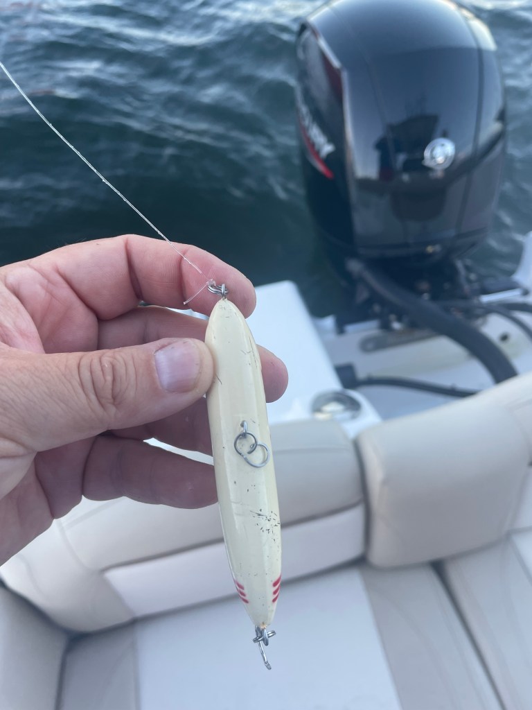 I arrived at the dock about 6:45am, which was pretty early as we can’t go out before sunrise; however, Gil arrived before me. While we waited for the dock hands to arrive and get our boat, I tossed out the Moonwalker, a top water bait. I did end up hooking up with a decent size lady fish but lost a lot of fish. I was getting multiple hits, but I wasn’t hooking anything. Later in the morning, when the sun came out, I found out why. The ring holding the midbody hook broke, so there was only the bottom hook.