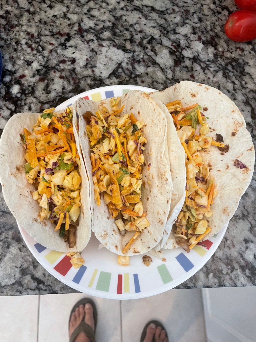 Once the fish was finished cooking, I put the fish on the tortilla shells, added the coleslaw, and topped it off with habanero mango hot sauce. It was a pretty good lunch if I do say so myself. I just wanted to share one of the ways I prepare fresh fish! I hope it gives you all some ideas! Please sure your thoughts with me on this meal!