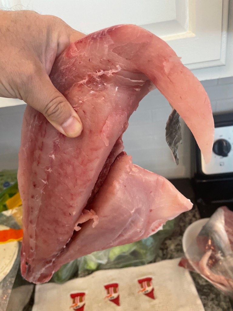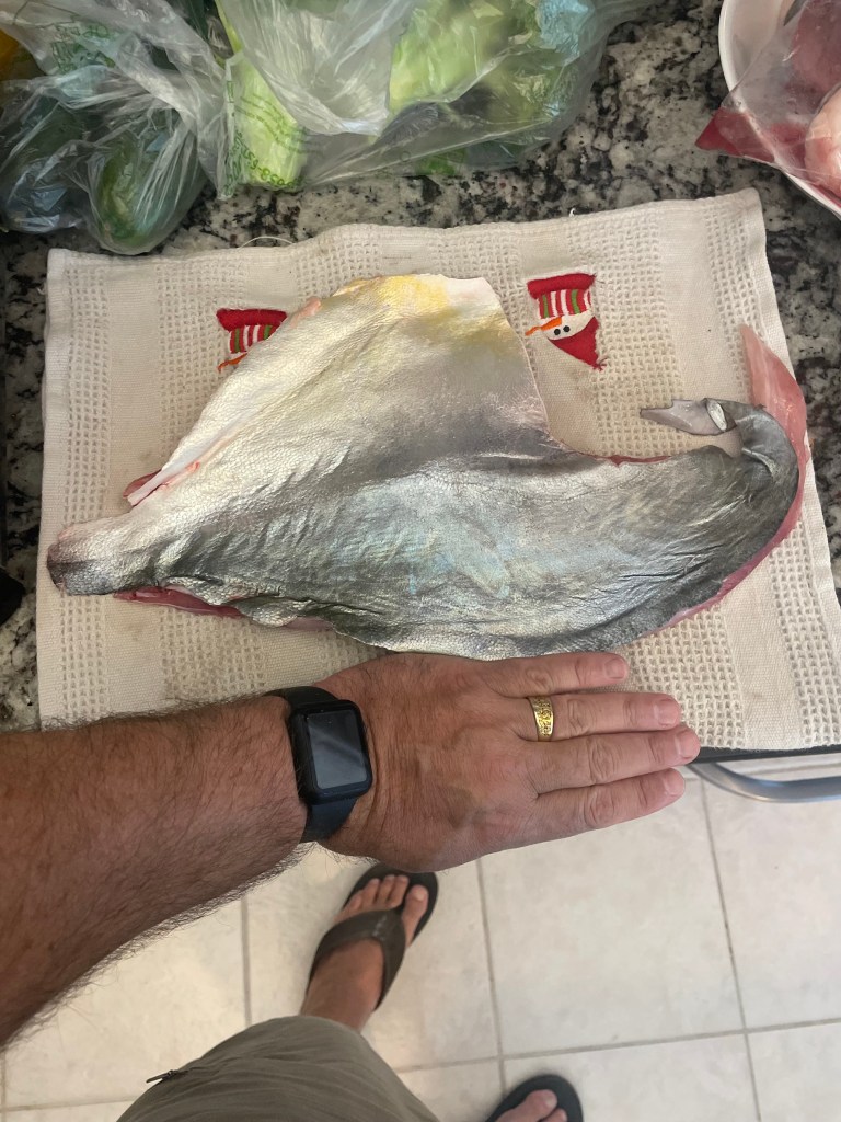 Once I got the fish safely on shore, I sat down and looked around. I was disappointed I did not have anyone to share this experience with. It was at this time I noticed my rod holder had broken and that is why my rod went flying to the water. Since Tania was out with her friends, I didn’t want to bother her, so I facetimed my good friend Darryl. I could barely talk due to being out of breath, but I was able to get through the story and I showed him the fish. After talking with my friend, I took a picture of the fish and texted it to Tania. Since Tania responded to me, I called her. She was happy I caught the fish but was mad at me as she wants to catch one!