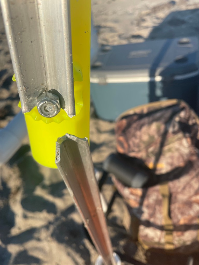 I set up my gear and had wet lines by 4:20pm. The water was a little rough due to the wind, but it looked fishable. By 4:30pm I had lost 3 fish, two to sharks. As I was sitting on my cooler getting another rig set up between texting my buddy Darryl complaining about getting sharked, my one rod and reel jumped out of the rod holder and headed toward the water. I dropped everything I had and ran after it.