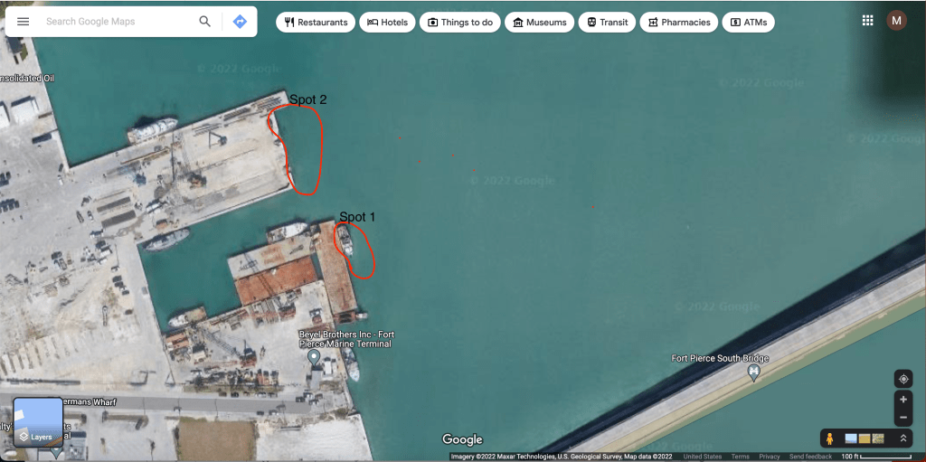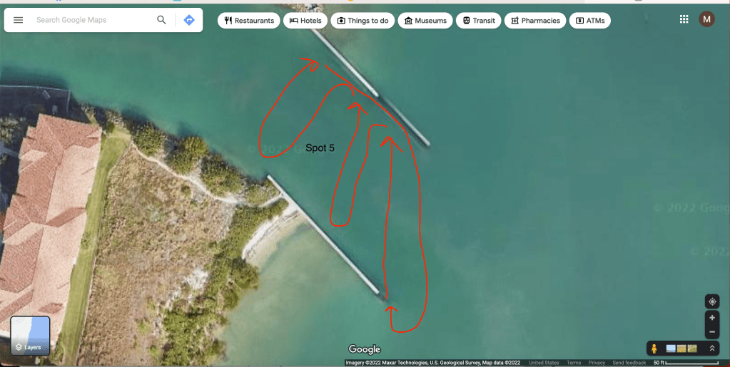 Tania wanted to start off in the turn basin near the barge, where she lost the larger fish last week. When we got over there, the barge was gone. I am assuming it was moved in preparation for hurricane Nicole. Since it wasn’t there, we started to scan the bottom looking for anything holding fish.