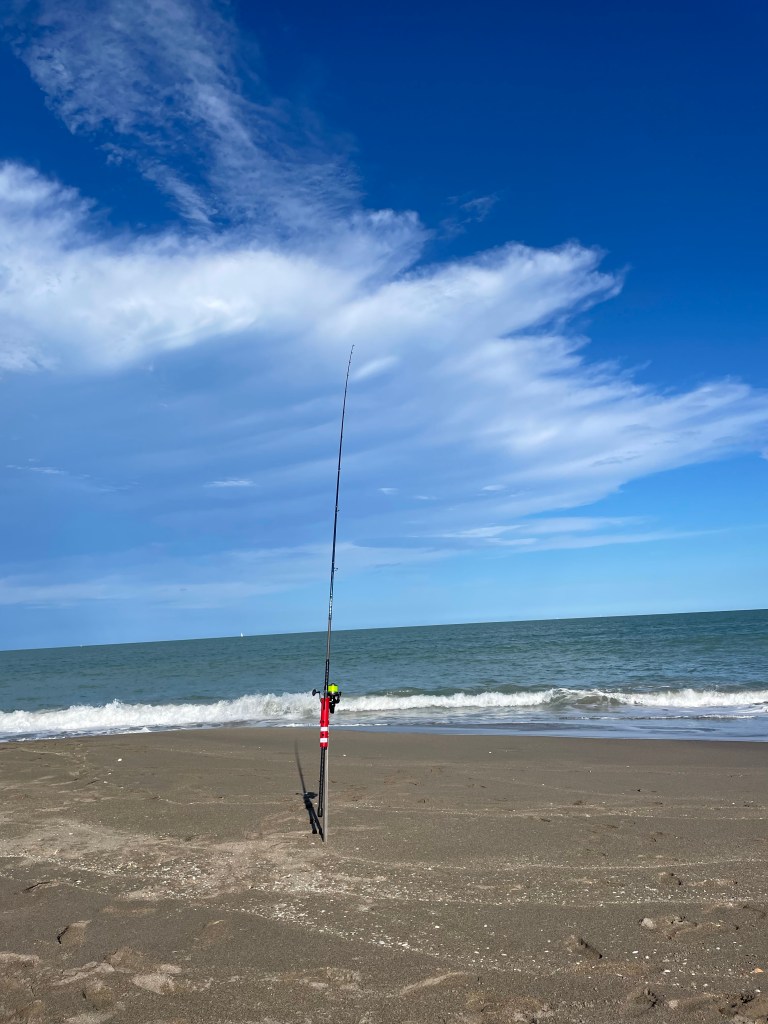 We arrived around 2:00pm. I unloaded the car while Tania and June went to save us a spot. Once I got to the water, I checked out the tide. It was an outgoing tide, we missed high tide by a few hours. While I was setting up our third rod the first rod got hit. I was excited to have brought in a short pompano in such a short amount of time. I was hopeful this was a sign of what was to come, unfortunately we didn’t get another bite for a bit.