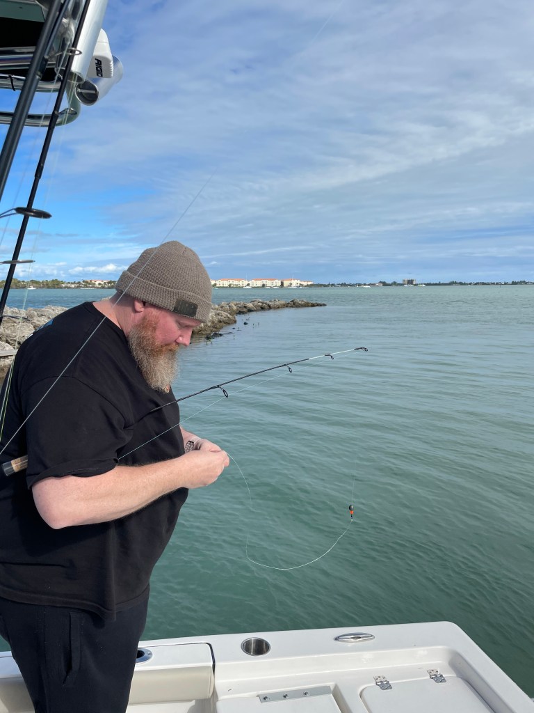 My buddy Darryl and his family came to visit, so I reserved a boat to take him fishing as he loves fishing. Unfortunately, we did not plan for the Siberian cold front that pushed its way to here in Florida. We woke up and it was 54 degrees and raining. The weather radar showed it should clear up about 7:00am so we headed out.