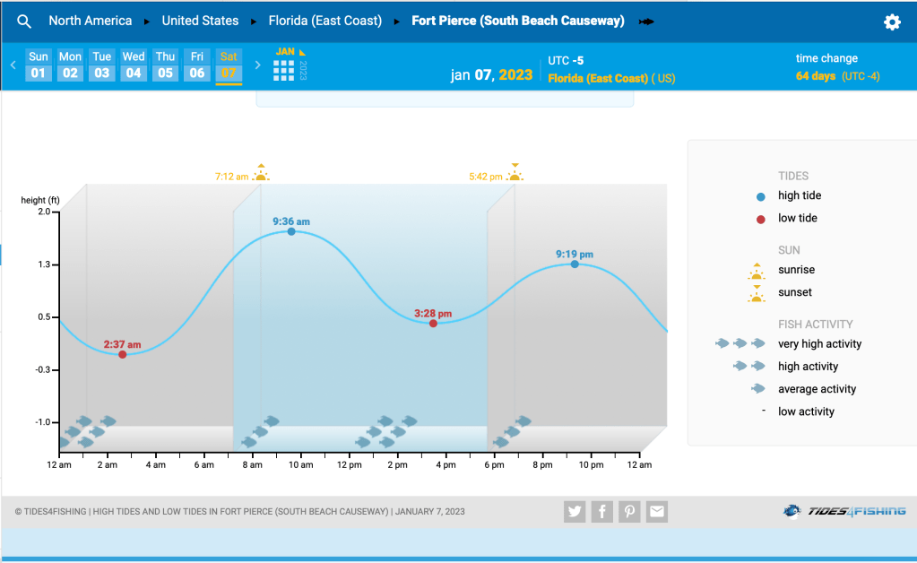Tania and I are looking forward to fishing tomorrow. The weather is cooler, only forecasted to be 51 degrees when we hit the docks. It should be an incoming as high tide is 9:36am. I am excited to be fishing the last few hours of the high tide as the water should be clear and hopefully some Pompano came in with the tide.