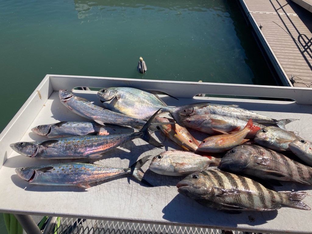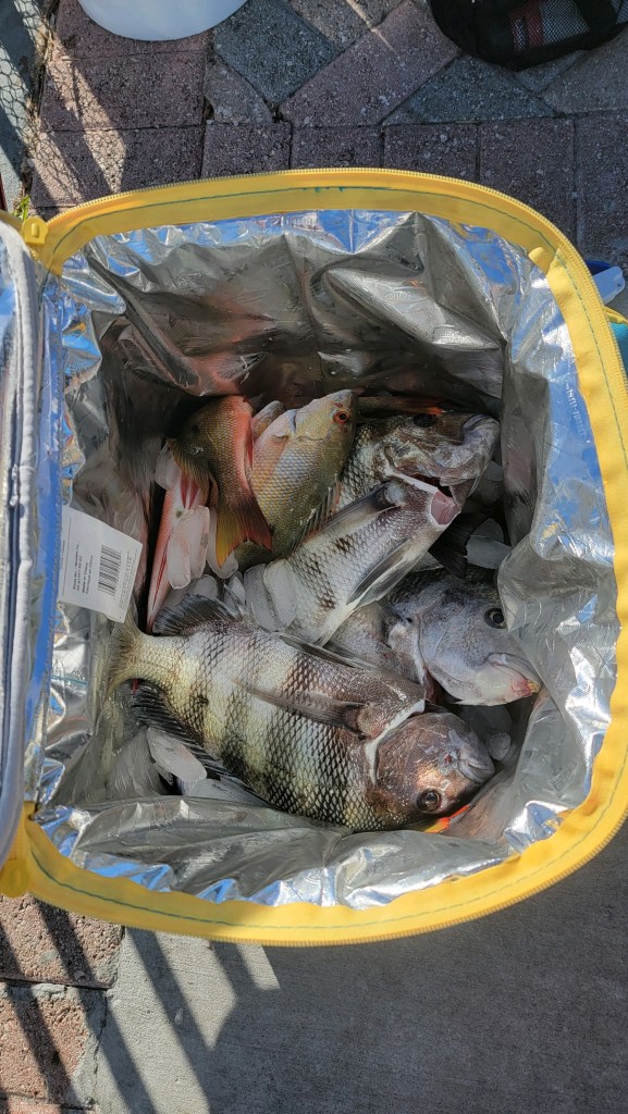 My buddy Perry decided to stay inshore with his friend. They started fishing right outside the marina by one of the rock barriers. The bite was hot, nearly as quickly as they bait hit the bottom, they were catching Snapper. They mostly caught short Mutton and Mangrove Snapper with a few Lane Snapper mixed in. They also caught a decent Sheepshead in this spot also. After a while they relocated to the Smithsonian Dock, where they landed a few more Sheepshead. When the bite slowed down, they decided to head south and try their luck at the power lines and then worked their way back north along the west shoreline along the docks. Unfortunately, they didn’t catch anything during their exploration. They ended up back north and drifted the Turn Basin with little luck. At this point they went back to where they started the day and finished off their bait. They caught many more Snapper but nothing worth bringing home.