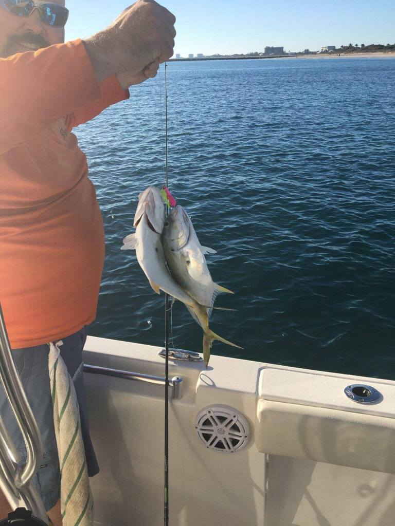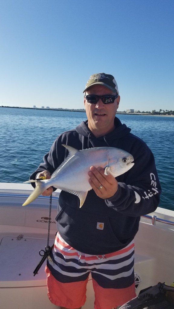 We decided to fish the beaches in search of Pompano, Spanish Mackerel, and Bluefish. Our first spot was just north of the Fort Pierce Inlet near Pepper Park. We were the first boat in the area, so we just looked for signs of life. It didn’t take long for us to see spinner sharks jumping all around and birds everywhere.
