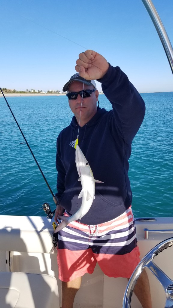We got to about Blue Heron beach and the water was such a beautiful powder blue, so we stopped and started fishing. We ended up catching 4 bluefish and a bunch of Jack Crevalle. Shortly after we arrived the bite completely died off, so we moved further south.