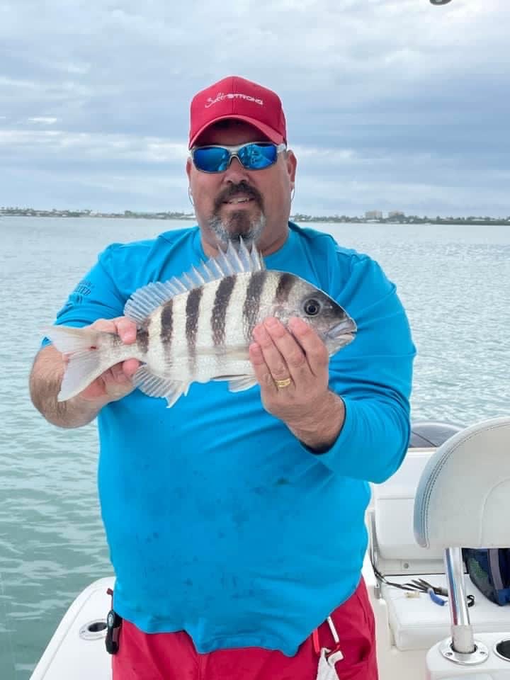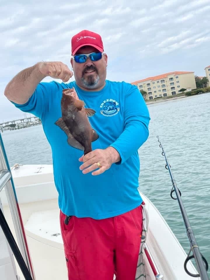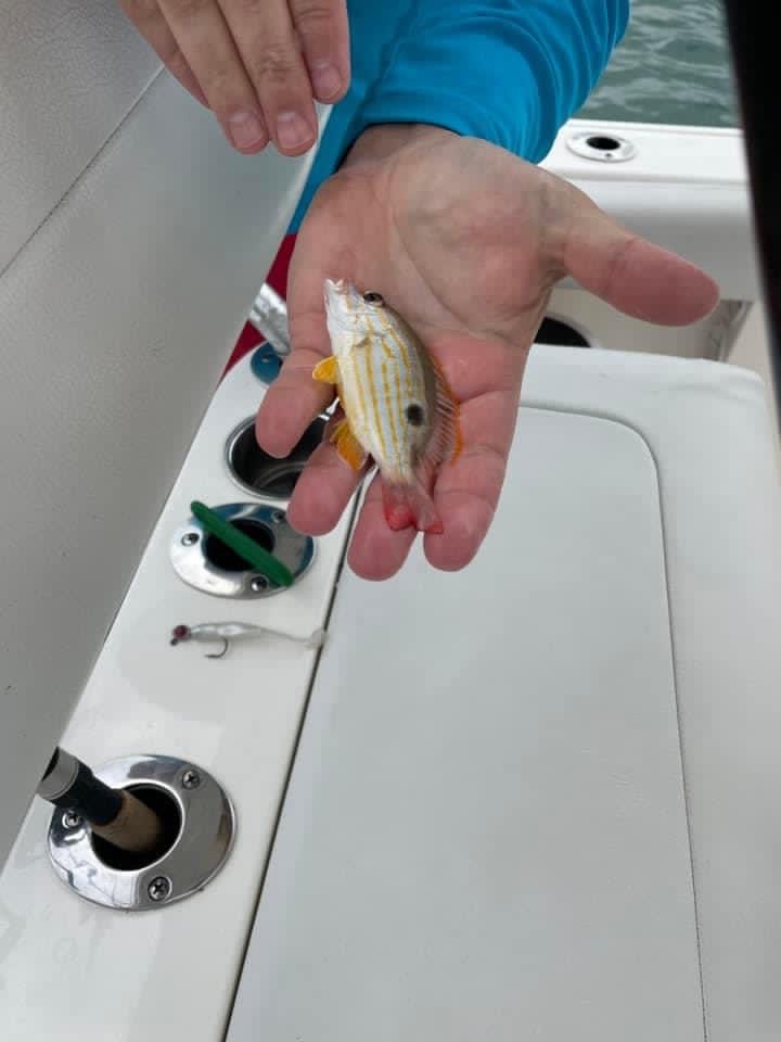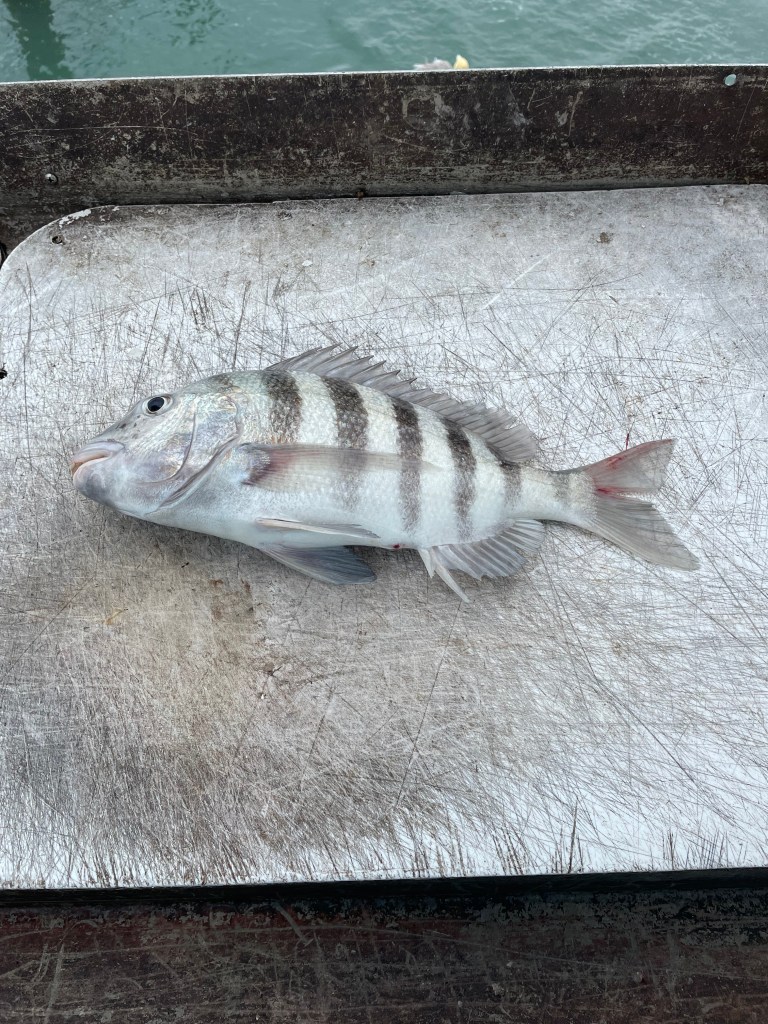 The next spot we went to, Tania recommended we go there. I was reluctant as we have never caught sheepshead there, but we went anyways. Once again, we started catching fish right away. We were catching decent size lane snappers and mutton snappers. After about the 10th fish Tania brought in a 14inch sheepshead! She was so excited to have caught a sheepshead as that was what we were targeting. We stayed here until we ran out of bait. We caught a Red Grouper, Mutton Snapper, Lane Snapper, a Yellowtail Snapper, a few Grunts, and the Sheepshead.