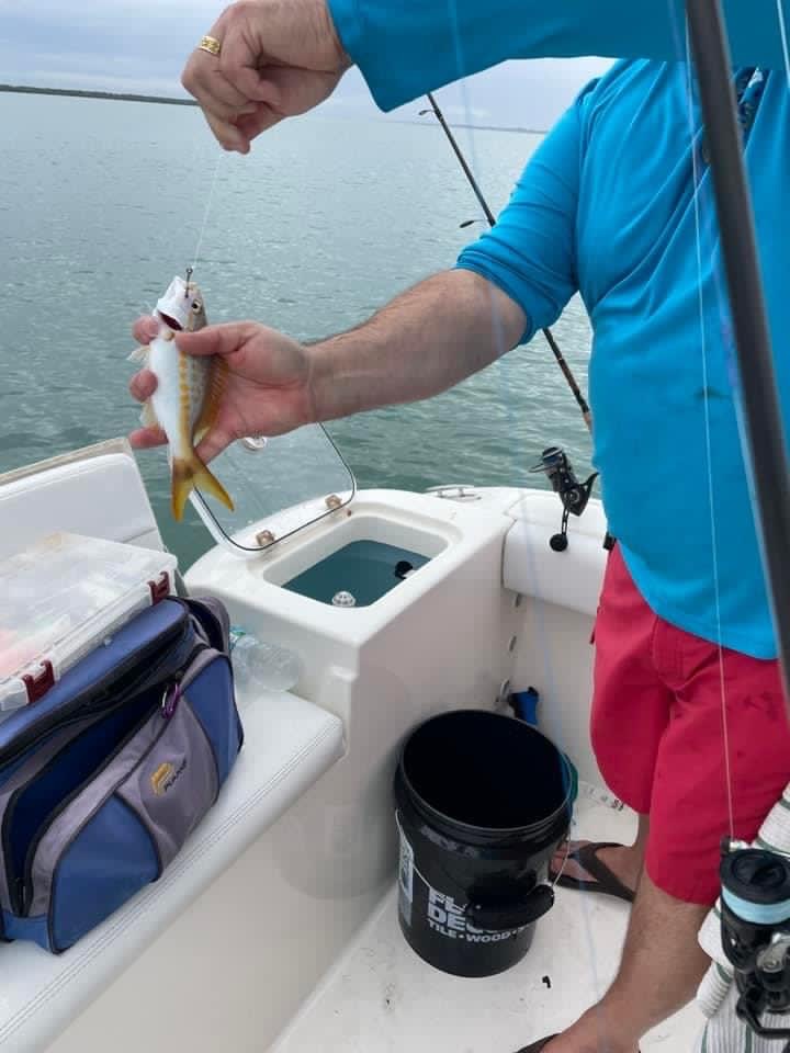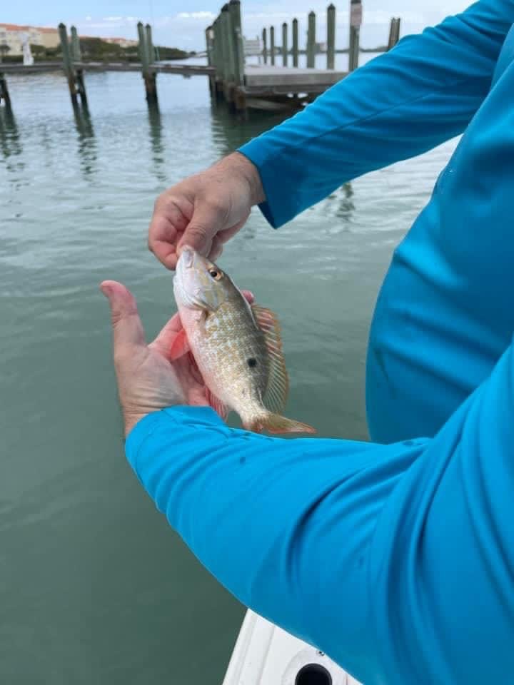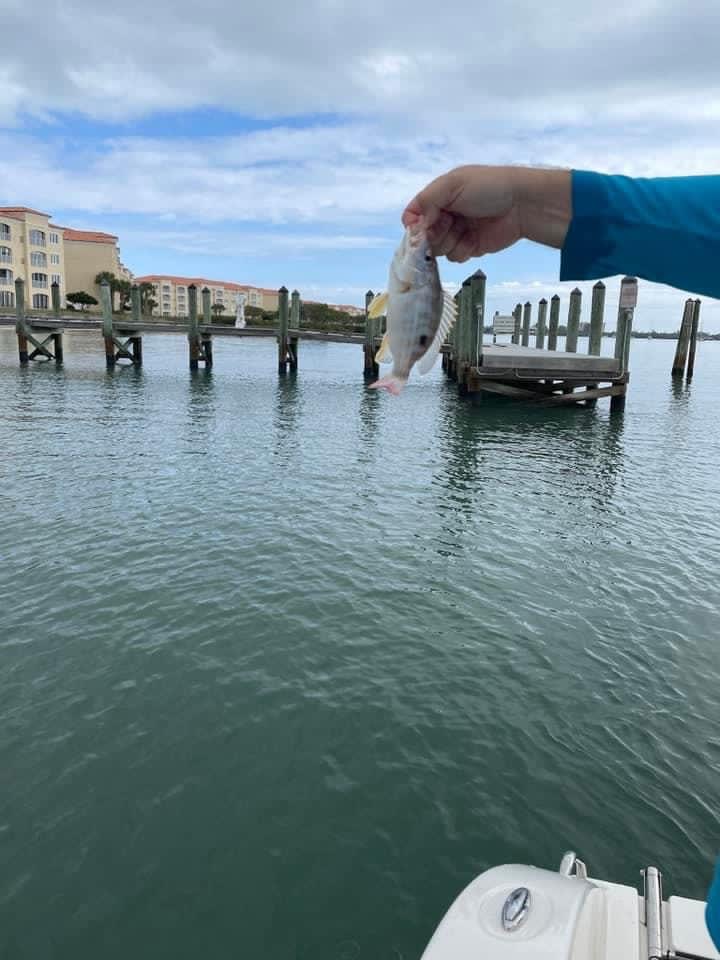 With an incoming tide and a North wind, I decided to drift south from South Causeway bridge. The drift failed to produce a bite, so I decided instead of another drift we would go out one of our favorite docks and see if we could get any sheepshead. Shortly after arriving Tania caught a 14-inch mutton snapper. It put up a pretty good fight, unfortunately too short to keep and it wasn’t a targeted species. We stayed at the dock for about 30 minutes. We caught lots of short snapper, but no sheepshead. Tania was really enjoying our trip though as she was catching fish and got to see more dolphins as well as a juvenile green sea turtle, which came up right beside the boat.