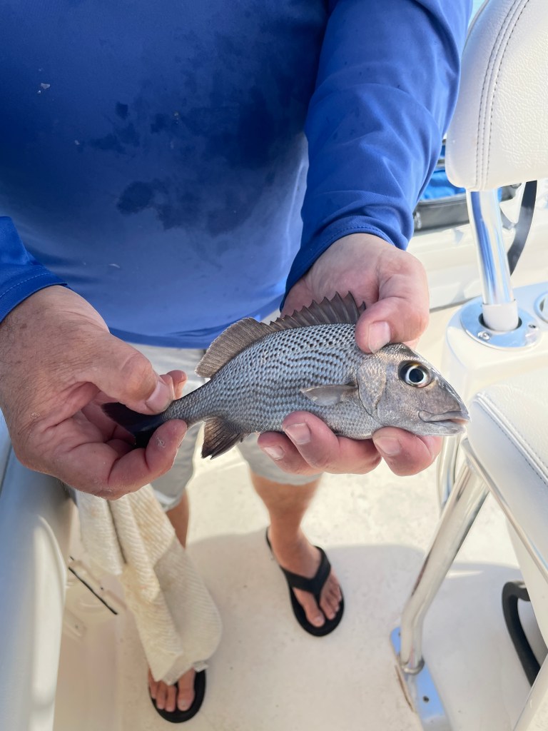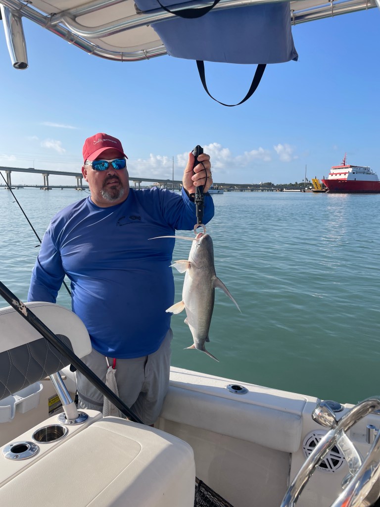With the current shifting directions and the SW wind, it was a bit difficult determining which way we would actually drift. The first attempt at drifting we ended up drifting more west than south like I had hoped. I repositioned and we did a second drift. This drift produced two Gafftopsail Catfish, one was pretty large, and it had a 5/0 circle hook in its mouth. I removed the hook and released it. My buddy Steve Smith of Forest to Sea Adventures, has a video cleaning and cooking a Gafftopsail and asking people what they thought. No one was able to guess it was a catfish. I put a link below to the video if you’re interested in seeing it.