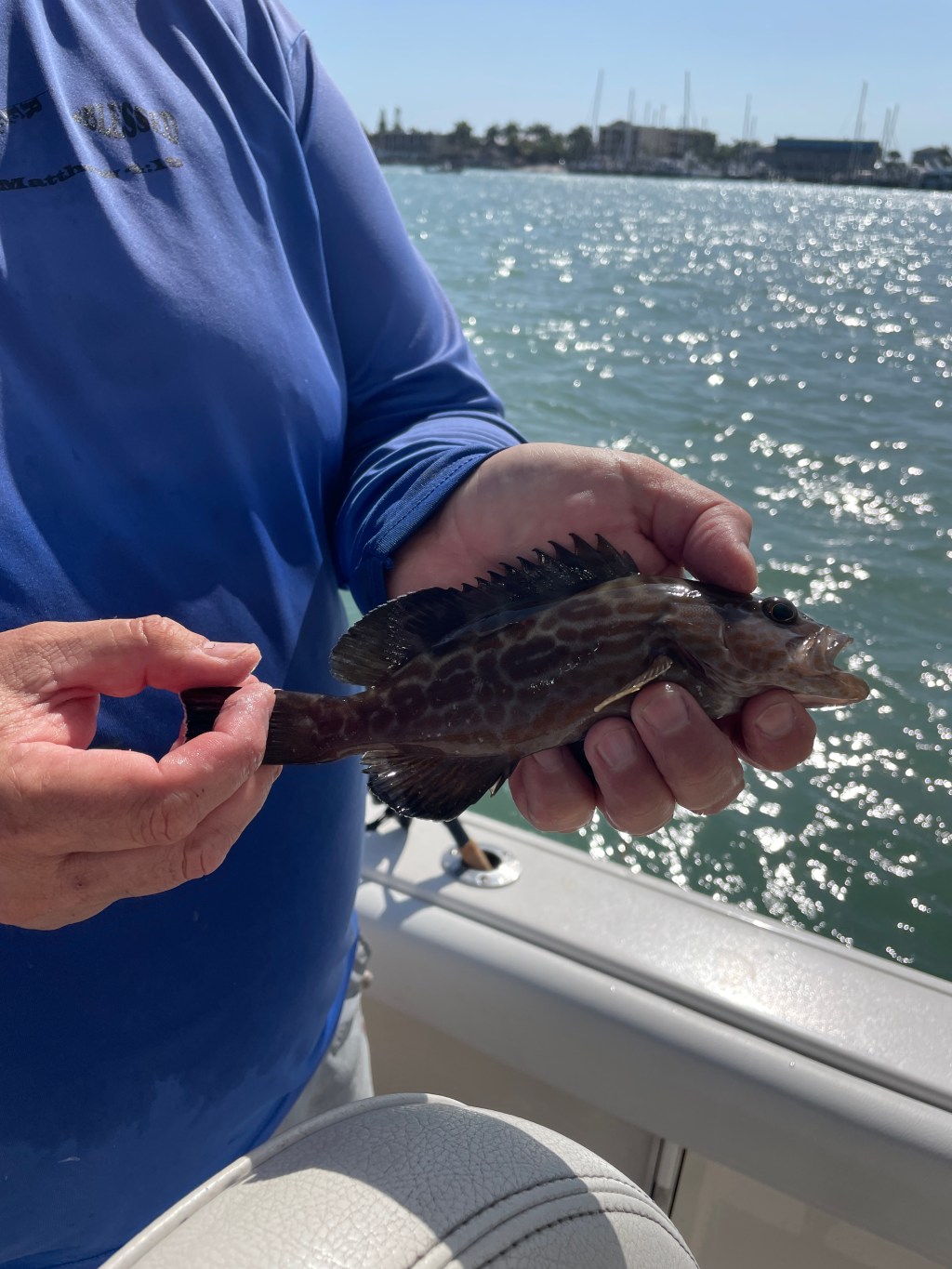 Tania mentioned going to the inlet and try drifting. Once we got to the inlet, it was a bit rough, so we decided to move back into the river. While coming back in, we decided to fish the day marker. This turned out to be a good decision as we ended up running out of bait at this spot. Tania was happy to finally be catching fish. In this spot we caught many short Mutton snapper, a juvenal Black Margate, a juvenal Black Grouper, several short Mangrove Snapper, and two 11in Mangrove Snapper.