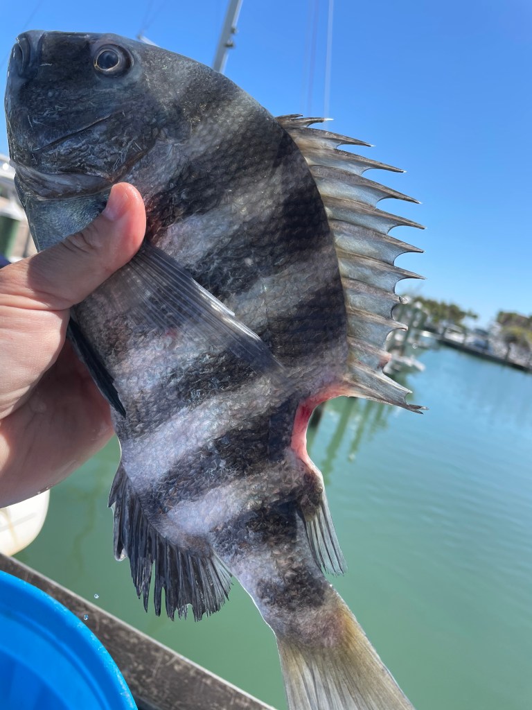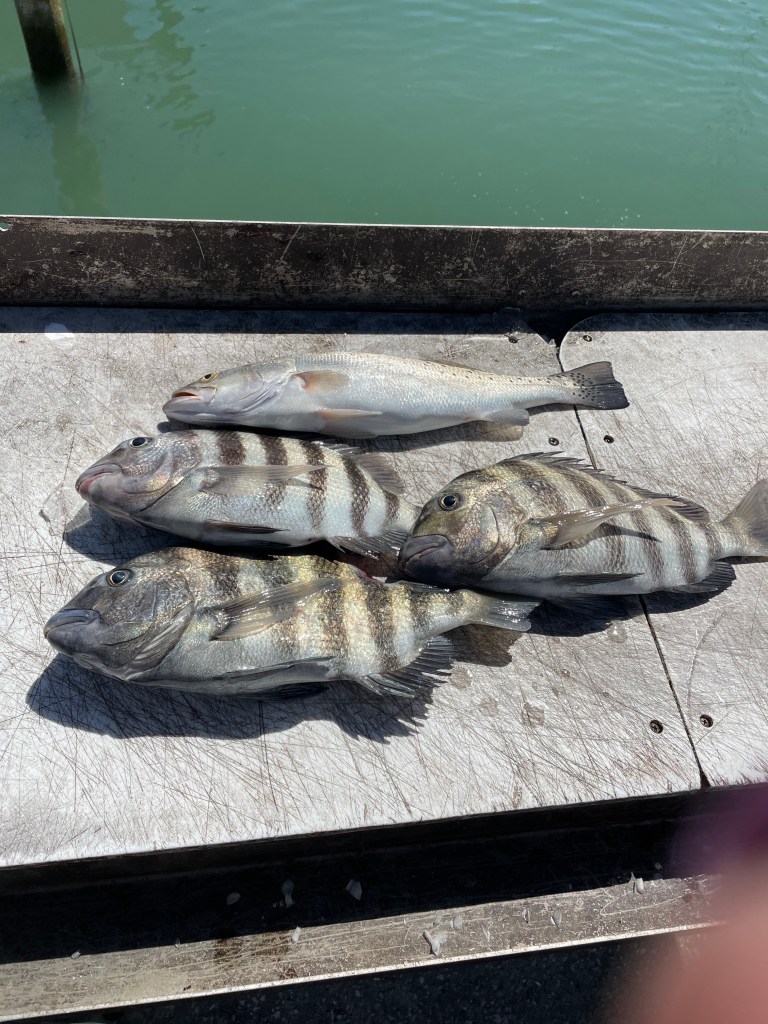 After lunch we decided to head to a dock we used to catch lots of fish at. While we were heading under South Causeway Bridge, the water cleared up a bit so we tried one more attempt at drifting. About 10 minutes into the drift I hooked up with a nice size sheepshead. I was hopeful we would catch a few more while drifting. Unfortunately, we did not get another bite. Our next spot was not hot either, but Tania did catch a short sheepshead. After 30 minutes with only a few bites and the short sheepshead, Tania and I moved to one of our friend’s secret spot. It was so secret even the fish didn’t know where it was. We spent 30 minutes here without a bite.