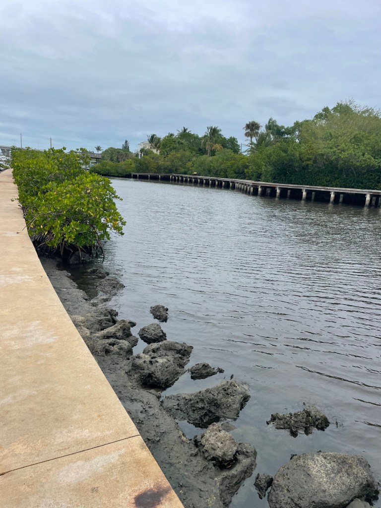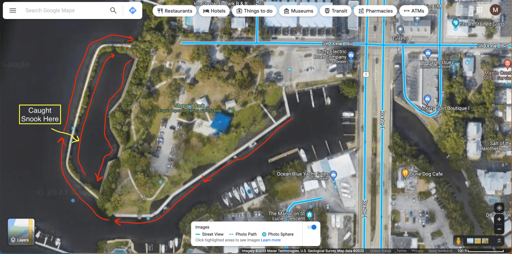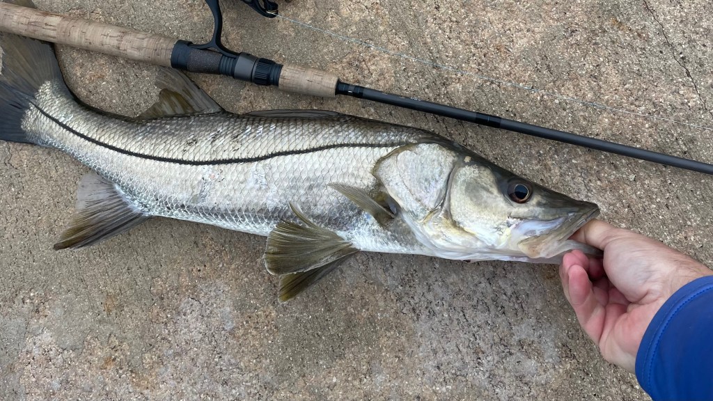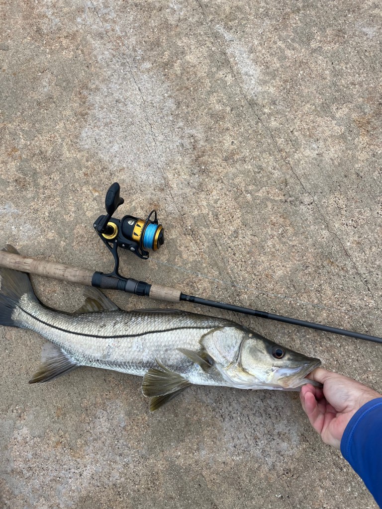 After about 45 minutes of working the wall, I moved out to the walkway that went further out into the ICW. I would alternate between the river and the pound, not sure what it’s called but it’s connected to the ICW; however, it was very shallow water leading into it. Shortly after the bend I was surprised by the thump of a Snook taking my bait! It’s an incredible feeling when you feel that thump. I ended up landing a 24inch Snook.