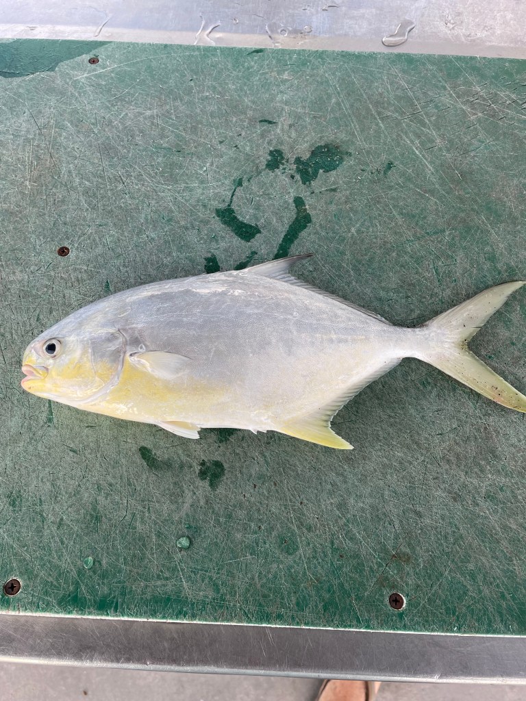 Within 30 minutes of setting up our lines, we had a bite of one of our rods. I ran over and quickly reeled it in, and we were both excited to see we had caught a Pompano. It was a decent size, and we knew it would make for a good dinner.