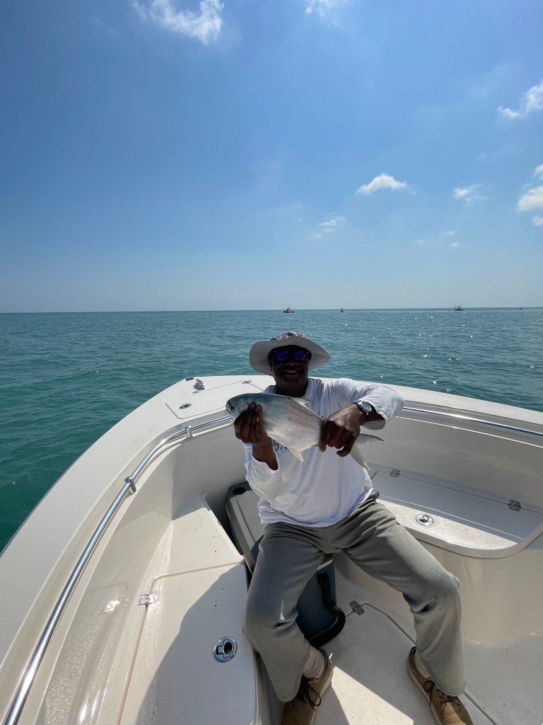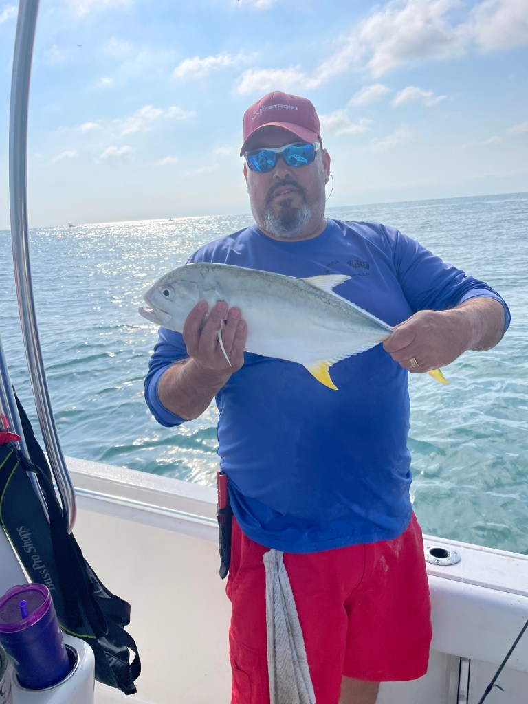 We began drifting using 30-gram jigs tipped with shrimp. Tania was the first to catch a fish, a 14-inch Pompano, shortly after we started our drift. The first drift yielded several other species such as Jack Crevalle, Blue Runners, Blue Fish, and a 4 ½ foot shark.