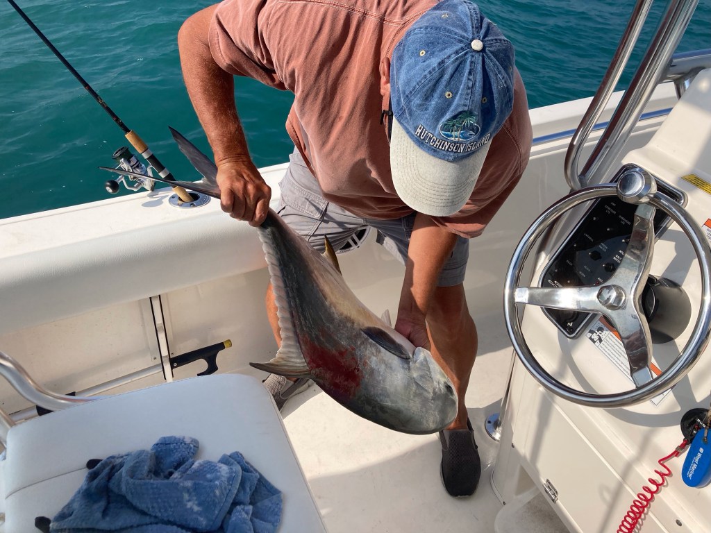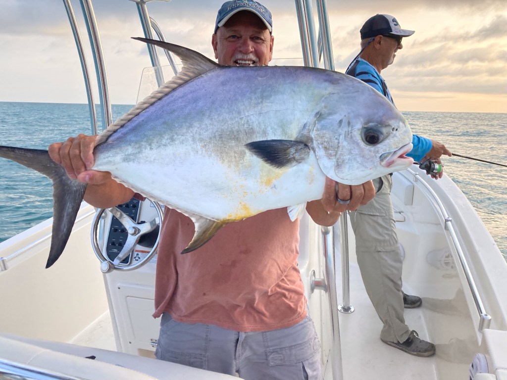 On their first drop, all three of them were hooked up within seconds, and the first drift produced multiple Jack Crevalle, Blue Runners, and two keeper Pompano. Shortly after beginning Their second drift, Captain Ed’s reel began to scream as a big fish took about 150 yards of line before they could get the engine in gear. After 15 minutes of slowly wearing the fish down, it surfaced, and they confirmed it was a 25lbs Permit. A few minutes later, they had the fish in the boat, and the day was already a success, only 30 minutes into their fishing trip.