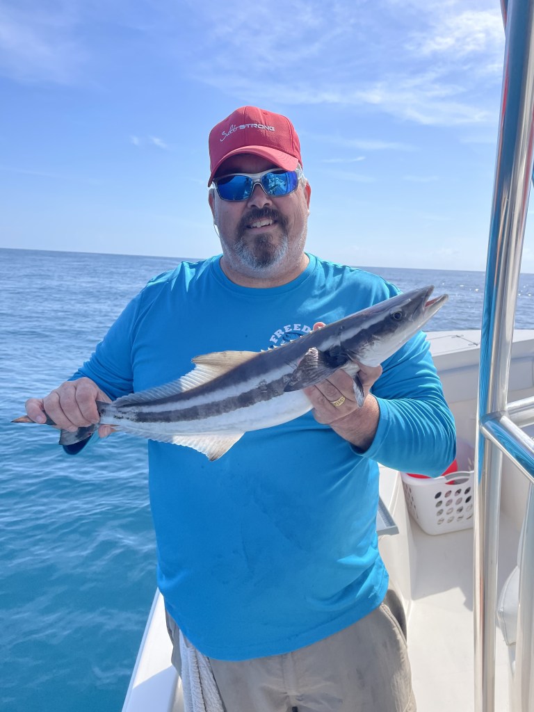 On the fourth drift, the pilchard on the freeline got hit. It turned out to be a short cobia. I was so disappointed, as I have yet to catch a keeper cobia. This same drift Joel finally got a hit and caught a blue runner that self-released at the boat. I was happy Joel finally got a fish.
