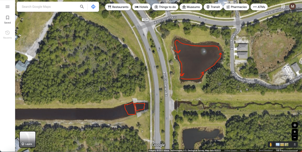 Work was a bit slow this week due to the weather. On Friday I left the office early and headed home to finish my day off. Once home I took an hour to try my luck at a local pond. The pond off NW St. James Drive, south of Publix on the east side of the road.
