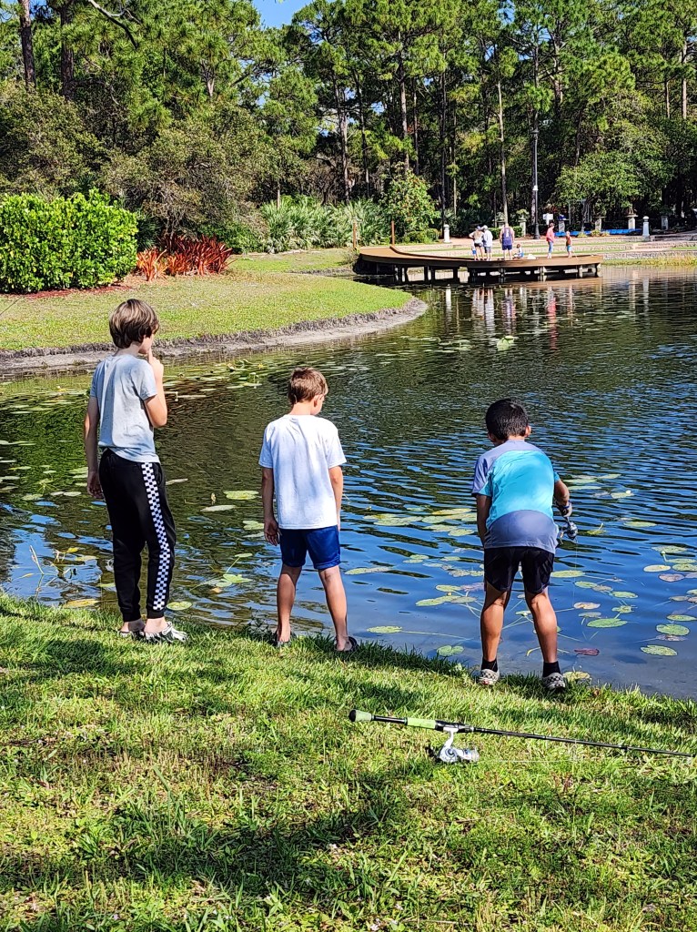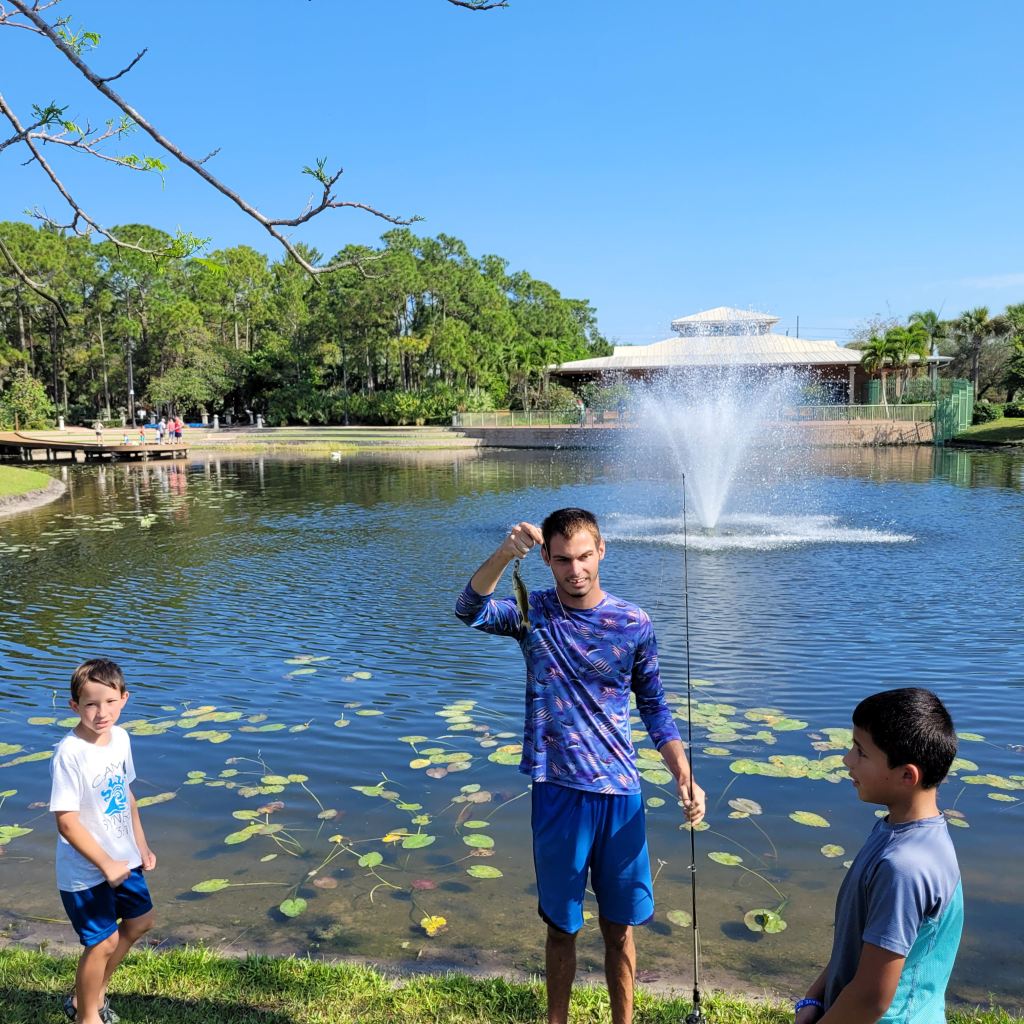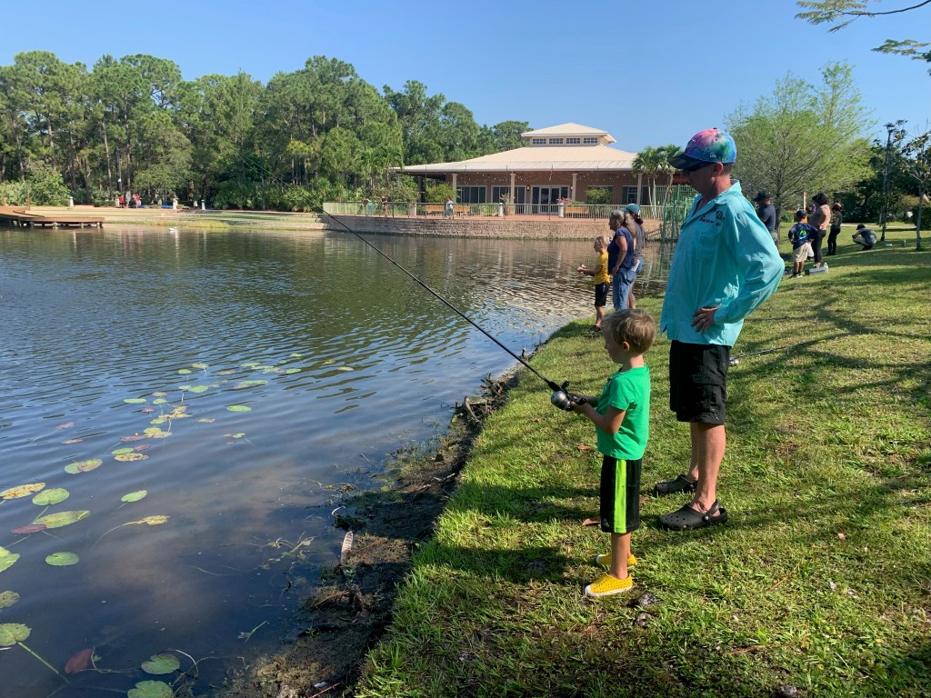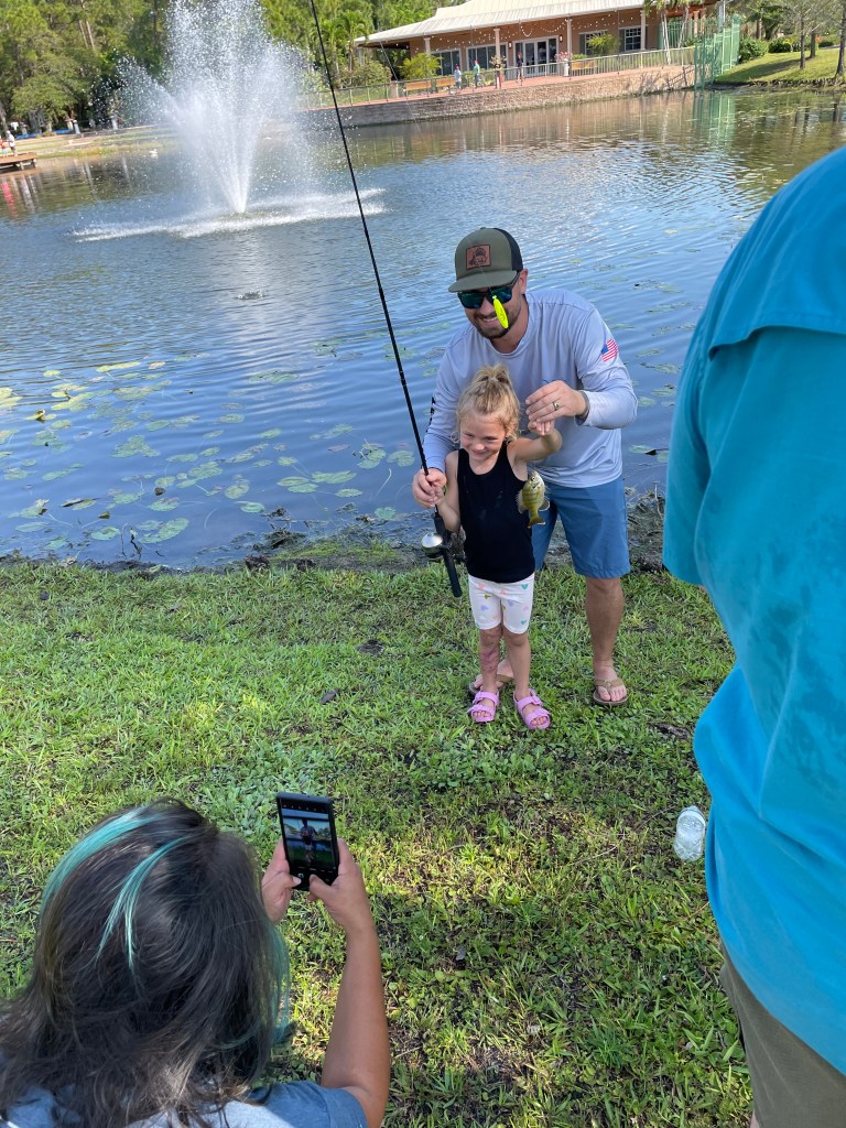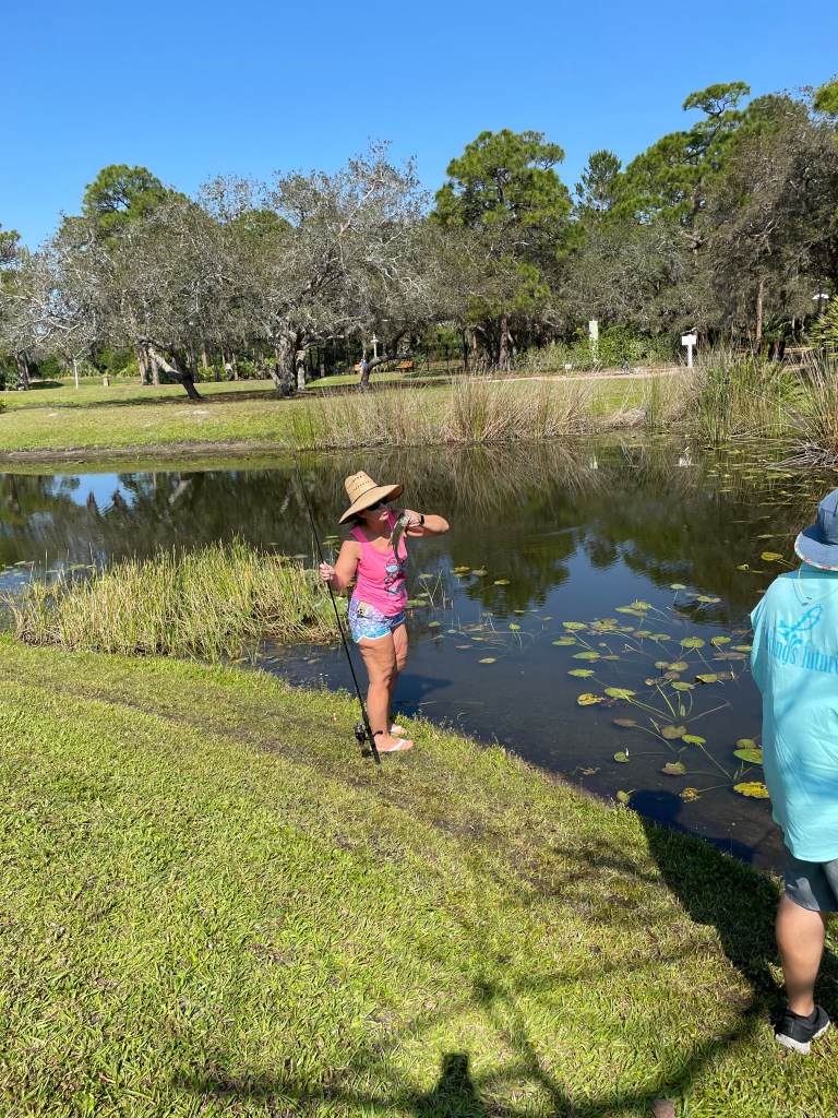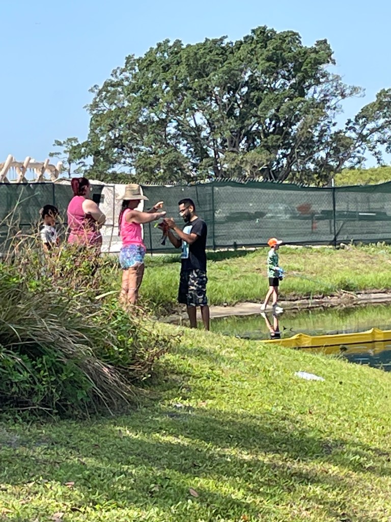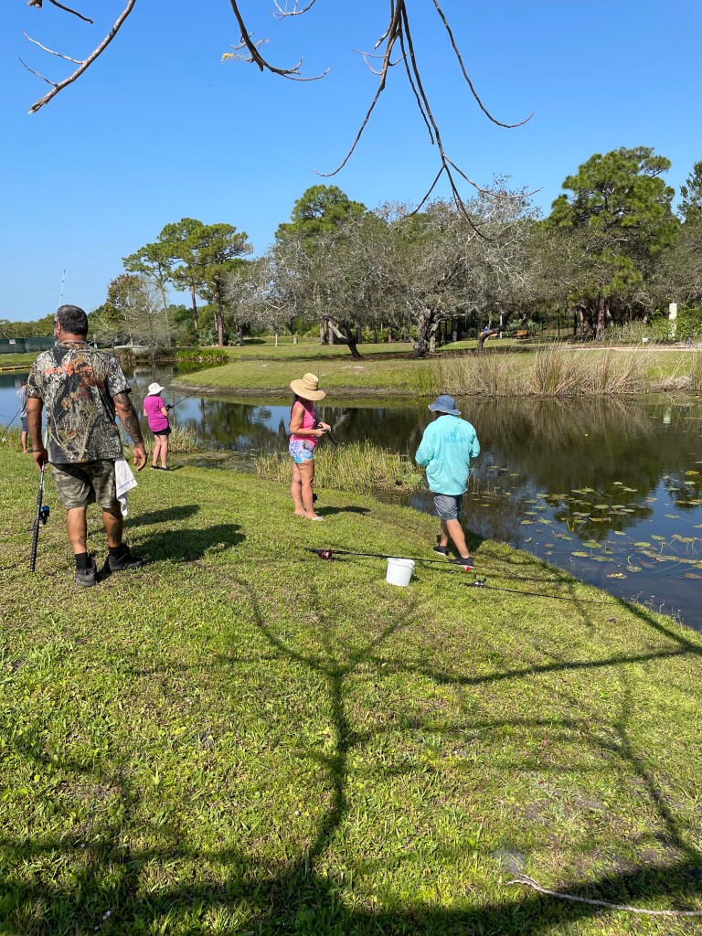 About 9:45am we brought all the families back together. We went over a few water safety concerns while fishing. First was always keeping an eye open for alligators and second was to watch the bank for fire ant mounds. I myself was unfortunate and stepped in one or two while talking with participants. After the short brief we provided all the participants with rods/reels and baits and we went fishing.