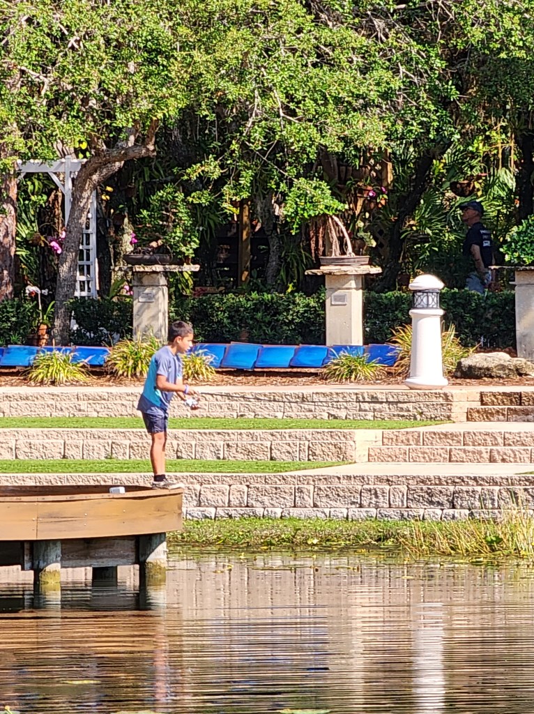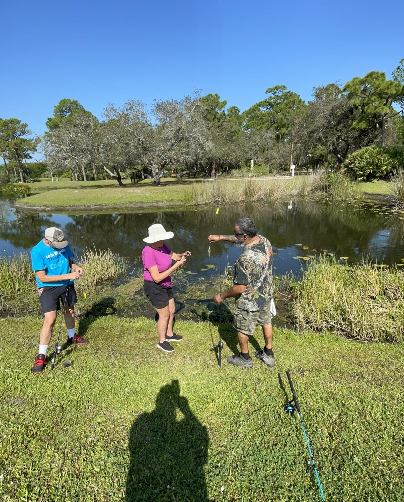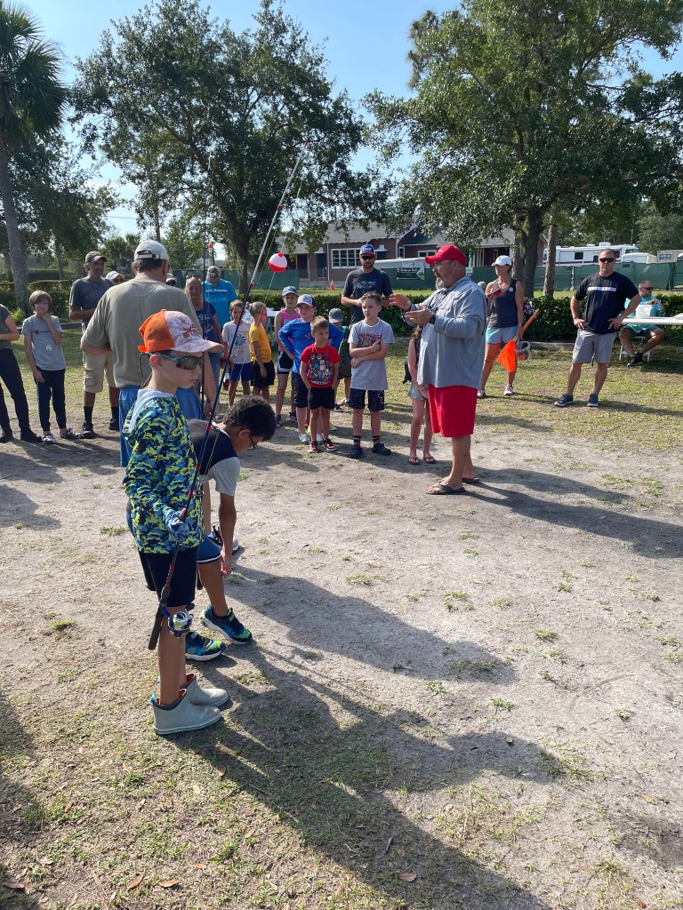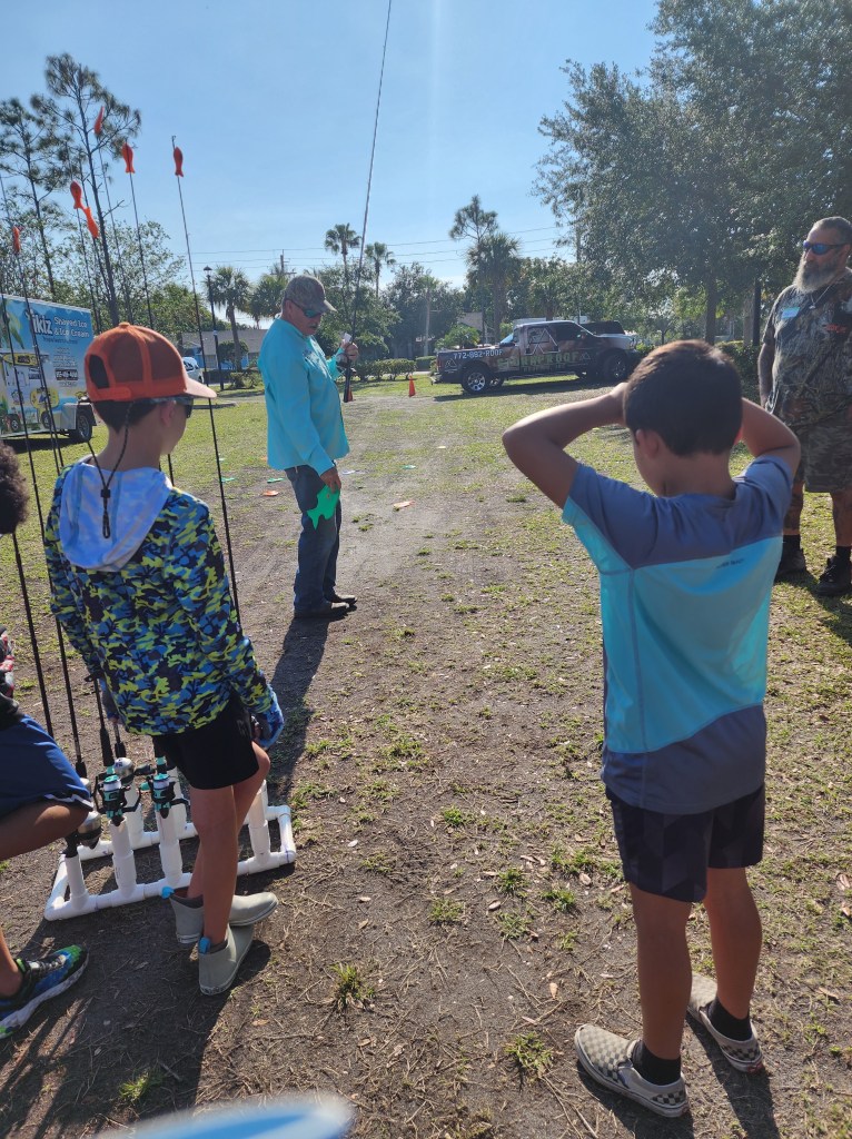 About 9:10am we divided the families into four groups. We had 3 stations, the first station was being taught the improved clinch knot, the second station reviewed rules and regulations and fish identification, and the third station taught casting. Three of the four groups would rotate though the three stations. The fourth group was return participants and the families were floaters, walking around helping others who needed assistance. We are trying to teach the youth how to be leaders and it’s amazing how they step up when you give them a purpose.