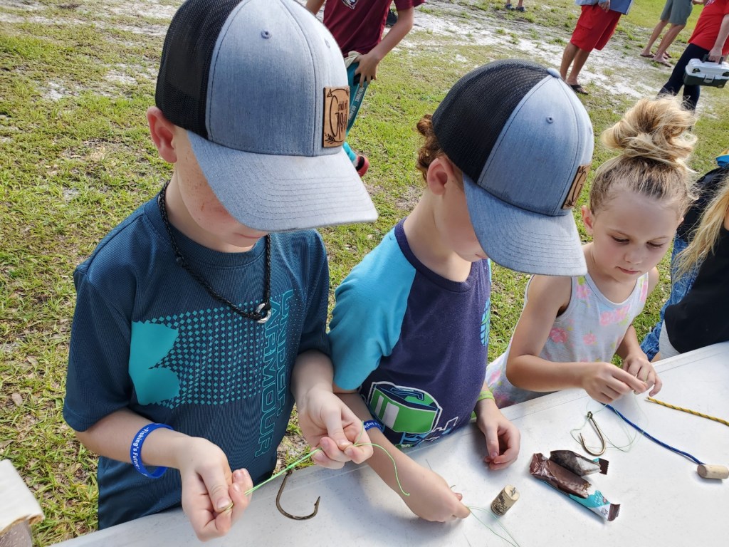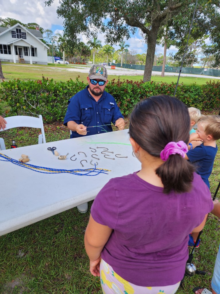 Following the water safety brief, we divided the families into three groups, each assigned to a specific station. The first group went to the casting stations, the second group went to the knot tying station, and the third group went to the basic tackle and equipment stations. After 15 minutes, the groups rotated to experience all three stations, ensuring that everyone had the opportunity to learn and participate in each activity.