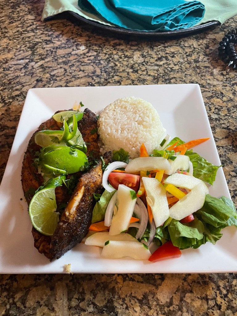 It was a long day and we finished it up with a nice meal in our air conditioned room. Tania, since she doesn’t eat fish, had chicken stir fry and a cheese board, while I had blackened snapper, broccoli, and coconut rice. My fish was pretty good; however, I enjoyed the blackened seasoning from the Secret Garden, a restaurant in Placencia we ate the night before, better.