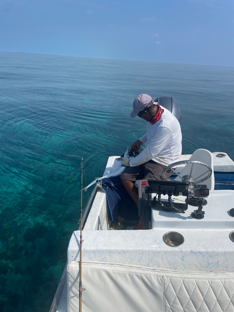 We trolled the shallow reefs for a few hours. In that time, we lost many fish as Tania, and I were still getting used to this style of fishing. We did land a few barracudas and several large needle fish. The real excitement happened when we came across a school of permit. Captain Erwin told s it was very rare to see permit at the outer reef. He turned the motor off and set up a rod to target the permit. Once it was set up, he handed it over to Tania and told her were to cast.
