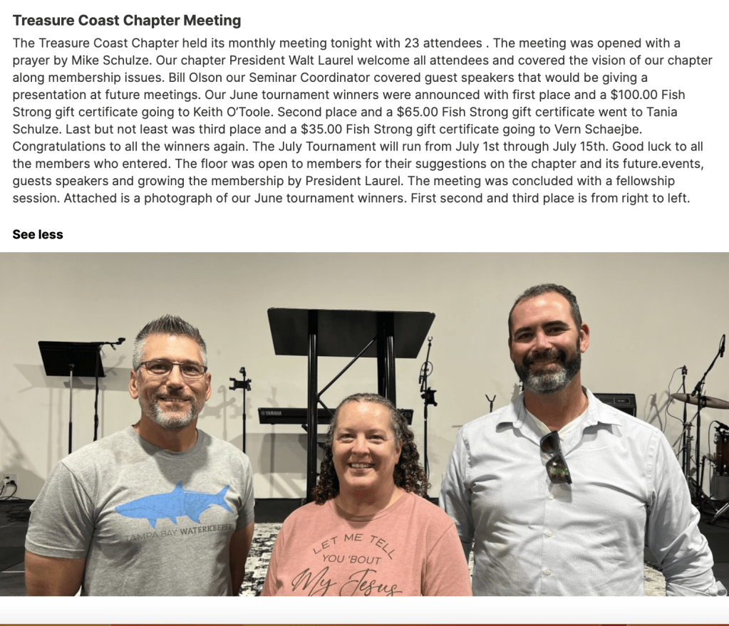 Salt Strong’s Treasure Coast Chapter held their monthly meeting on Thursday. This was the first meeting in which we held a tournament. June’s tournament fish was snook. The rules of our tournament are simple, you get an entry for up to three fish between June 1st and June 15th. The club would randomly draw three names from all the entries and they would be awarded in order of drawing from first to third place.