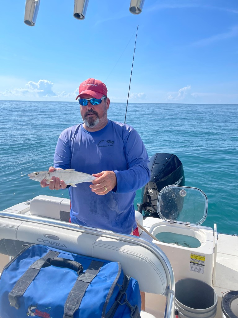 We were the first ones to arrive at the dock on this beautiful morning and looking at the tides it was perfect timing for catching permit at the boils. We seem to do best catching them at high tide as the water seems clearer. Once we loaded up and started to head out of the marina, I called Dave from Dave’s Live Bait to see if he still had any threadfins. He did and told me he would be at Stan Blum.