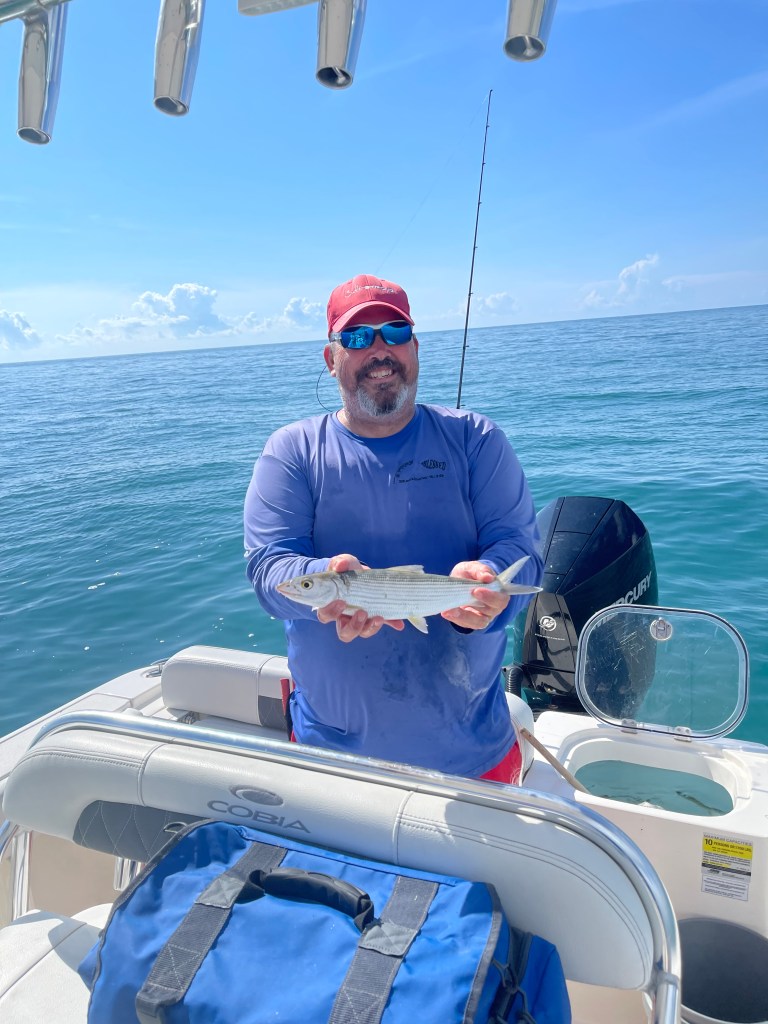 Since we could see fish the whole way back to the inlet, I decided to troll back instead of continuing to cast as we were all tired. It didn’t take long and both rods went down. The one popped off and Devin started to fight the other. Since we were trolling the fish took a lot of line and I had to start chasing it down to get some line back. Once we were heading to the fish Devin was able to fight the fish the rest of the way to the boat. The fish took almost 100 yards of line so it took Devin awhile to get it to the boat. He was really excited to finally catch a larger fish. It wasn’t the permit he wanted but a large bonita puts up a good fight also!
