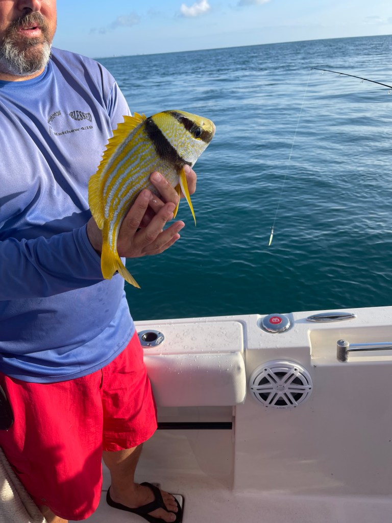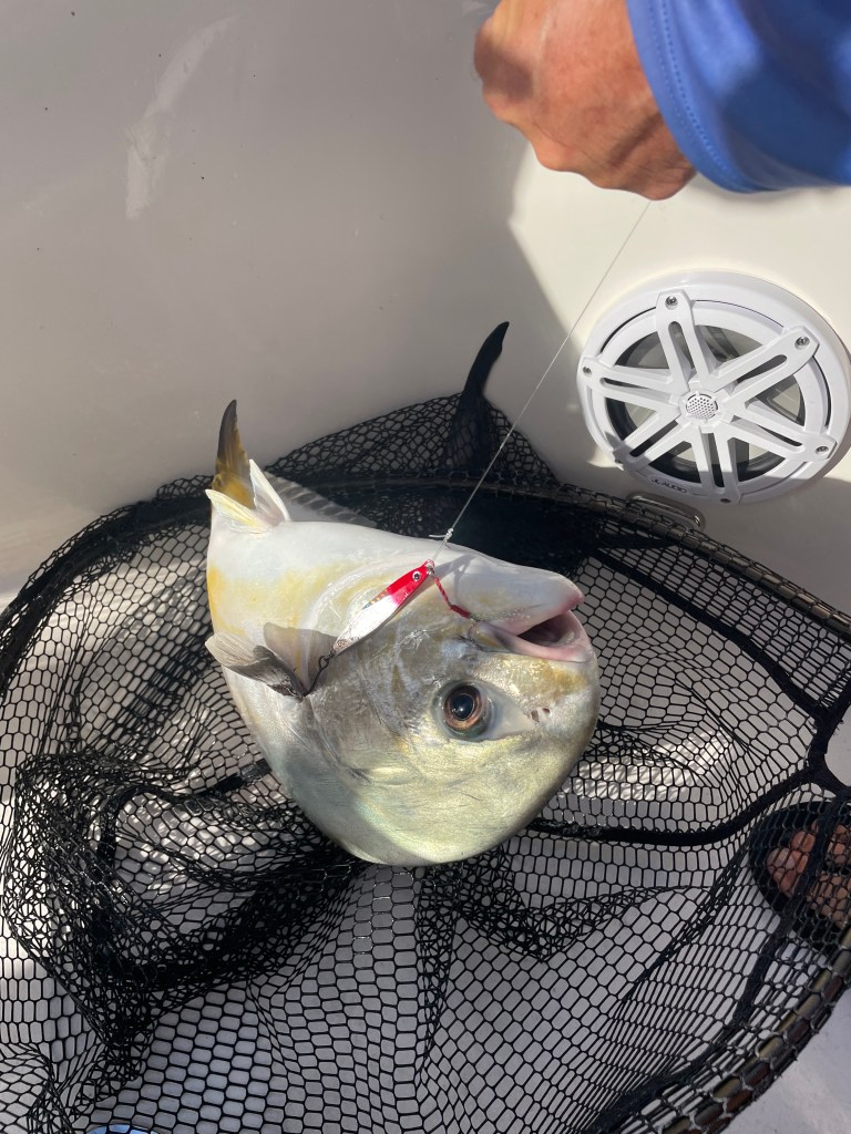 The bite was slow the first drift, however we were seeing life all around us. Towards the end of the first drift Devin hooked up and landed a small porkfish. We decided to move a bit closer to shore since the bite was slow on the first drift. Shortly after we started our first drift Tania hooked up with something big and was fighting for a bit. When she got it to the boat, she was so excited as she landed another permit! This was a good sign as I was hoping to put our son Devin and my buddy Darryl on a permit.