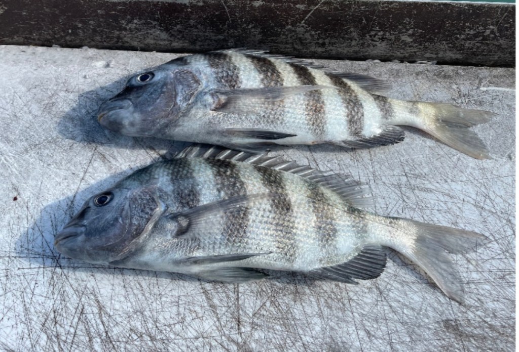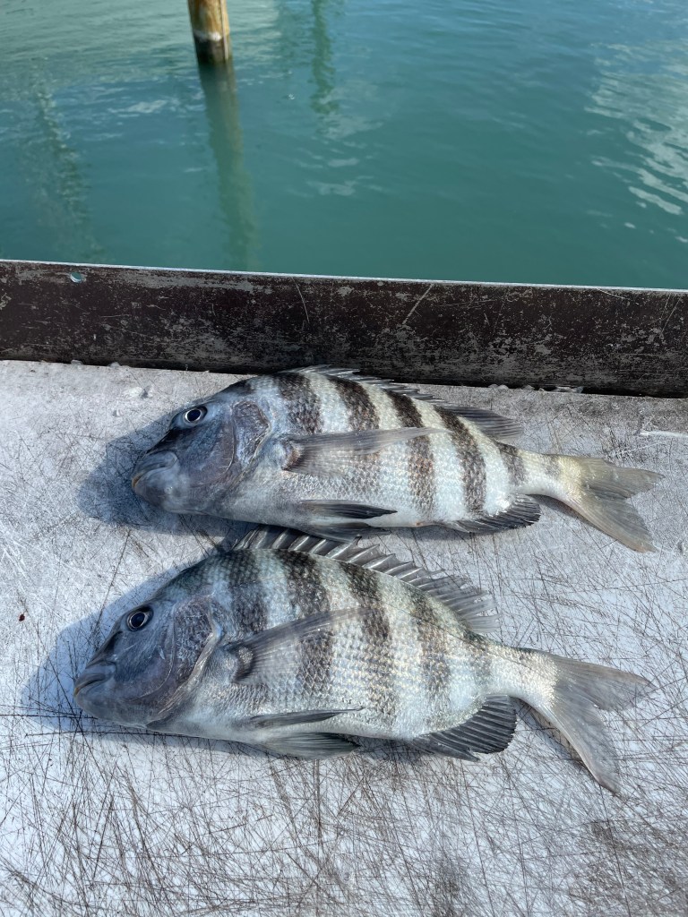 Undeterred, we decided to anchor up near the waste treatment plant, and it didn’t take long for both Tania and I to feel the excitement of getting bites. After a brief wait, I managed to reel in a 13-inch sheepshead. The action continued for a while, but then the wind suddenly picked up, making it a bit challenging to fish in our current spot. We decided to relocate to one of our other favorite spots, but to our dismay, someone else was already there, so we opted to try our luck near a channel marker.