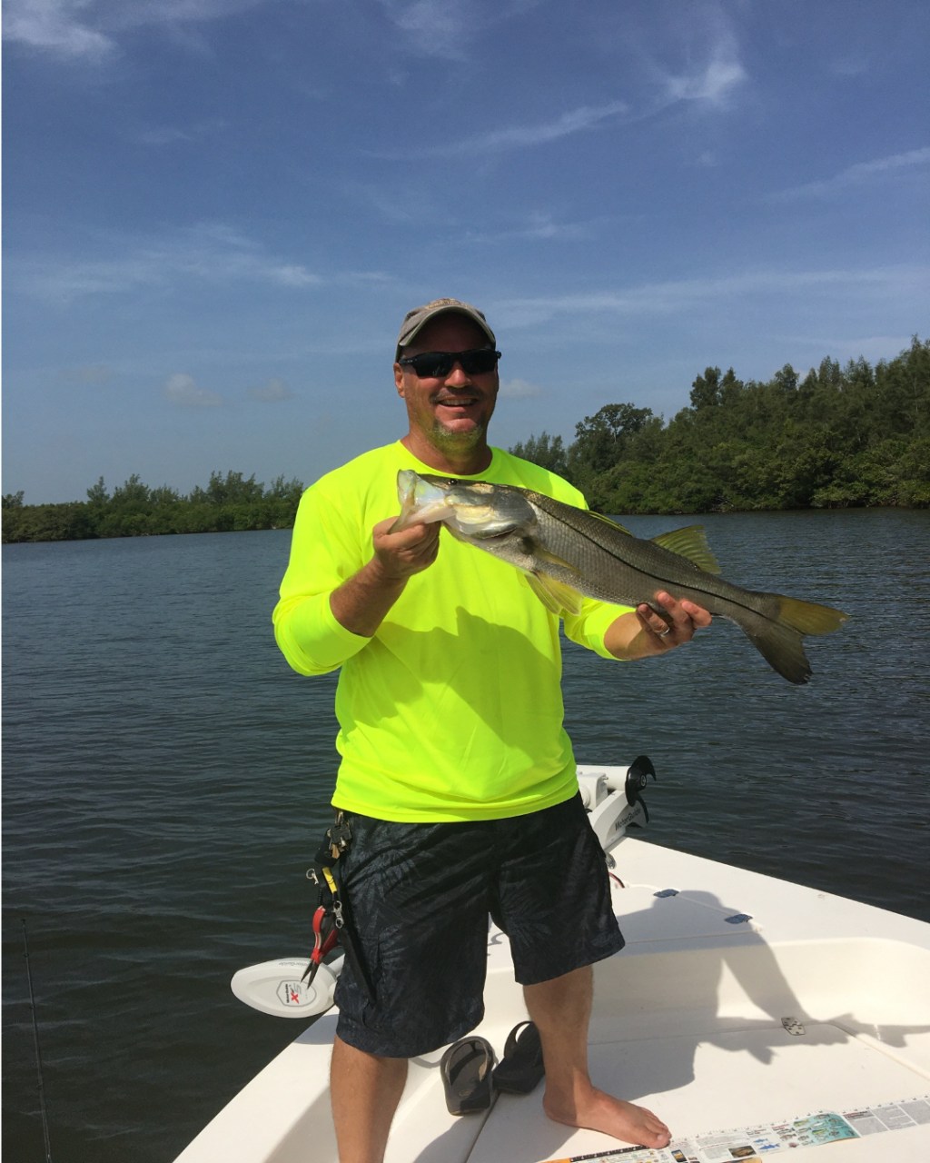 About 10 minutes into the drift, Gil hooked up with something large. When it came up, we verified it was a nice snook. Gil fought the snook for a few minutes before he could get it to the boat. We measured it, and sure enough, it was a slot snook, so it went into the cooler. We were all excited that we had a fish coming home with us.