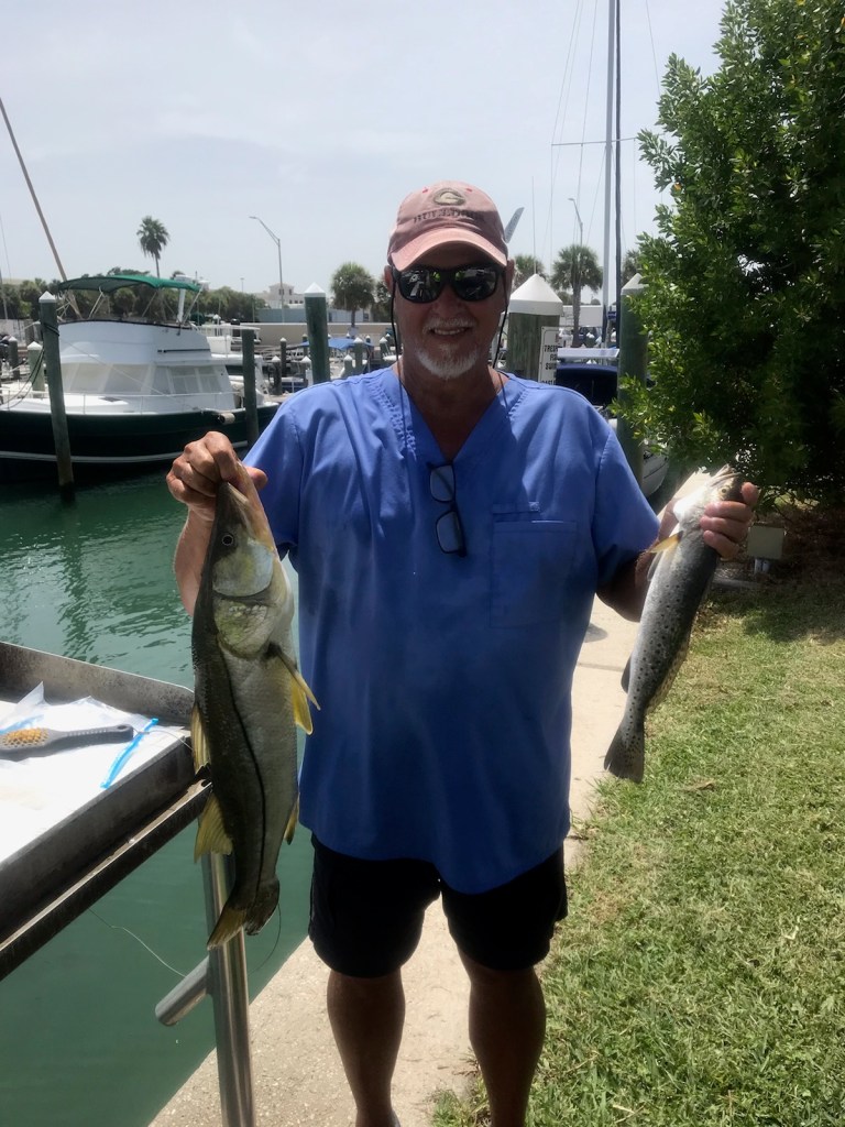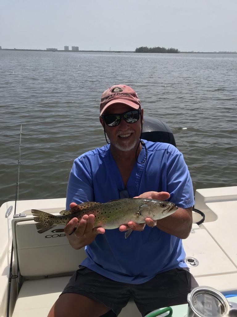 Ed changed to the same swim bait and started casting in the mangroves. Just a few casts in, he landed a nice trout. By the time we finished the drift, we ended up in the west corner at Harbor Branch. We were all overheating, so we beached the boat and got into the water to cool off; however, the water was 87°, so it was more like bath water and not as refreshing as we had hoped.