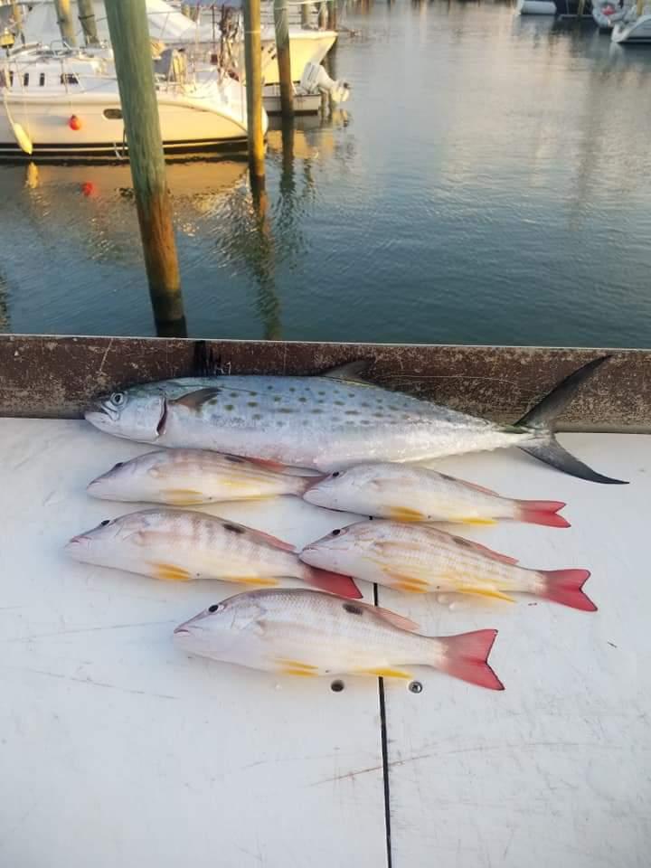 We had a successful afternoon on the water, catching various fish. We landed mangrove snapper, lane snapper, schoolmaster snapper, porkfish, grunt, grouper, rockfish, spanish mackerel, blue runner, and Jacks. Out of all the fish we caught, we only kept five lane snappers and one spanish mackerel.