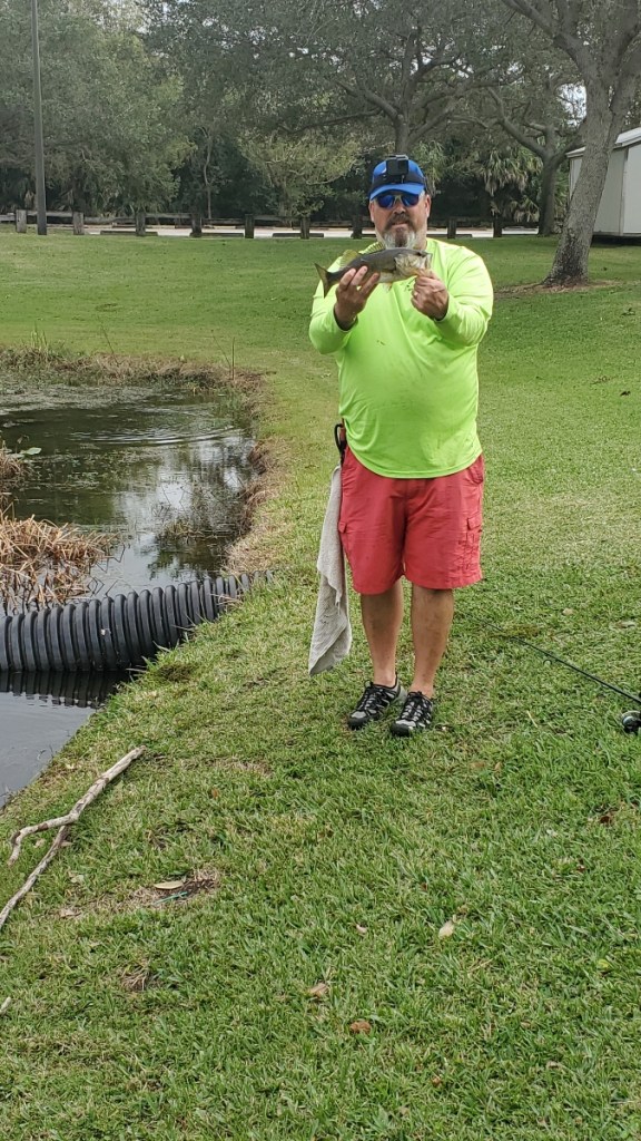 Seeking new waters, we ventured to the pond at Rotary Park, hoping to catch a few more fish. Here, I had the thrill of reeling in a feisty 12-inch bass, accompanied by Perry’s encouraging cheers. Perry also lost a few baits here but did not land any fish.
