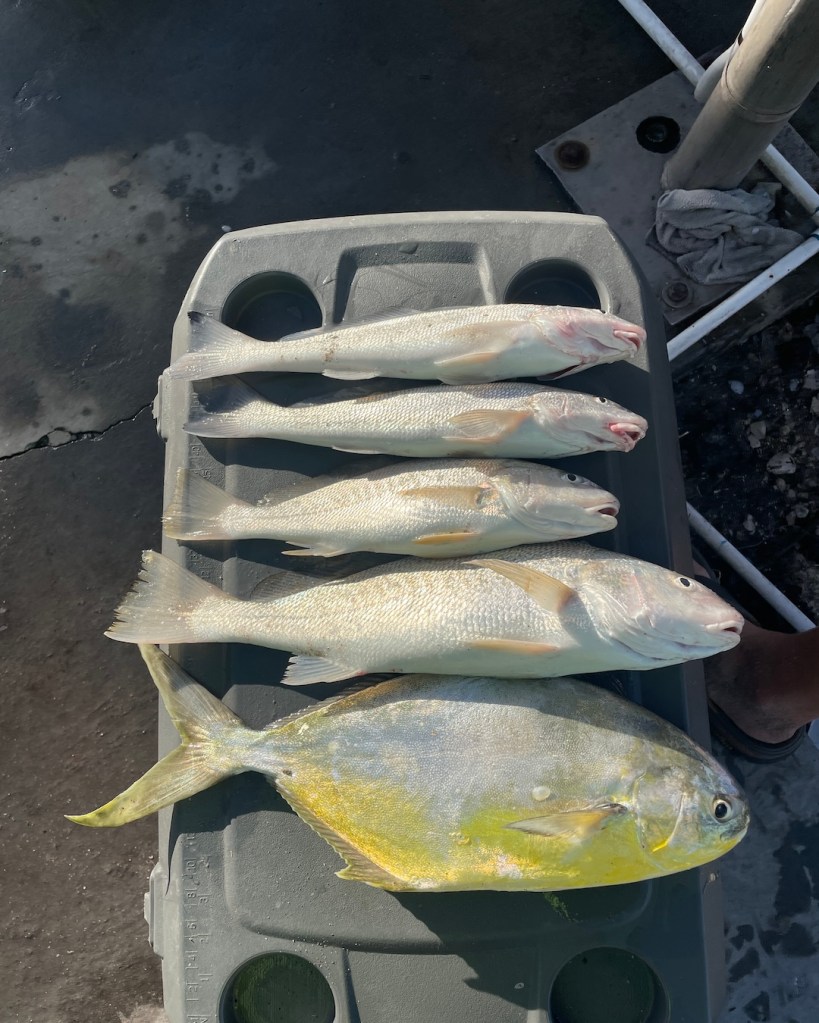 After the fishing trip, we all went our separate ways to get cleaned up for supper. I told my friends since we have pompano, I wanted to make them a fresh fish supper. I blackened all the fish we caught, and Tania made coconut rice. It was a great way to finish up the day with our friends.