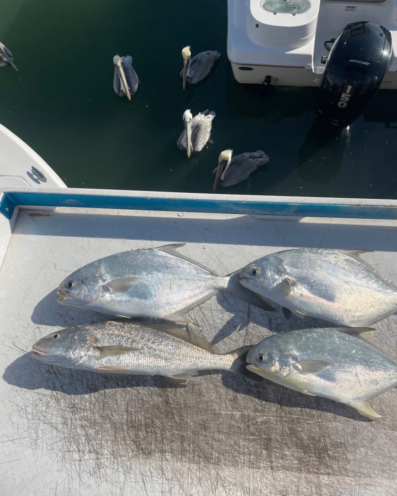 After having fun catching jacks, we moved to the west shoreline to work the docks. Vern told me he saw videos of people catching pompano and permit in the area. We worked the docks and drifted for a while with little success. We mostly caught small mutton snapper; however, I caught a very nice croaker, who promptly went into the cooler.