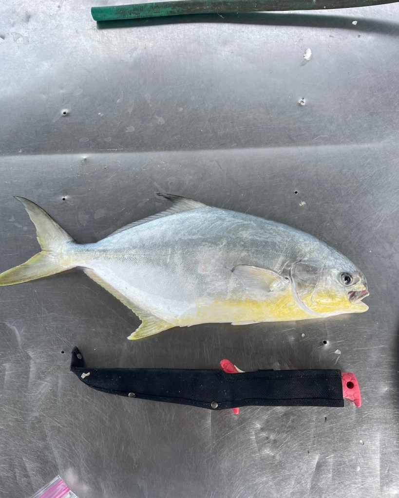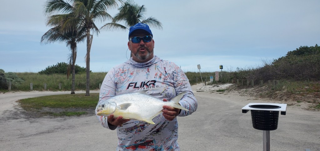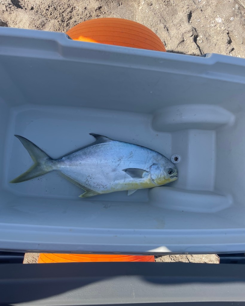 As the hours passed, the bite remained elusive, testing my patience and resolve. But amidst the stillness, there was a sudden flurry of activity around 10:30 am. The first rod bent over, signaling a bite. As I was reeling in my first catch of the day, an 18-inch pompano, another rod went, and thankfully, the gentleman next to me grabbed it before it went into the water. Once I landed the first fish, another rod went; unfortunately, shortly after I started reeling, that one in a shark took my rig. Whatever was on the second rod was lost before we ever saw it.