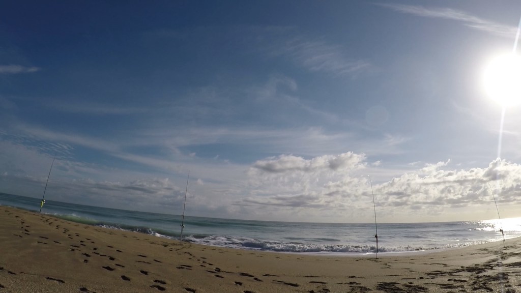 Arriving at the beach around 7:30 am, the incoming tide greeted me, promising a day of potential catches. High tide was hours away, giving me ample time to set up my four rods and cast them into the waiting waters. Once they were all cast out and set, I sat back in my chair and admired the beautiful creation before me.