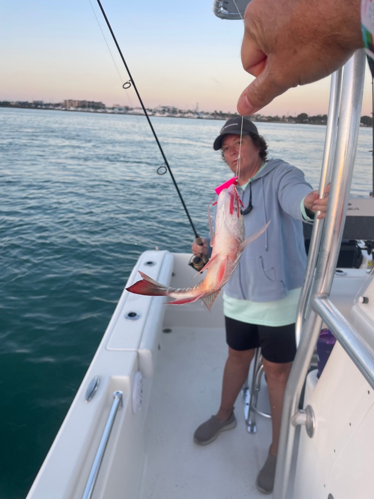 Shortly after we said our goodbyes, we started drifting. Tania started fishing with a pink pompano jig with a chartreuse teaser, and I started with a yellow pompano jig with a white teaser. The first drift was decent; neither of us got stuck on the bottom, and we both caught multiple fish. I was hopeful that the first drift would be an indicator of how the day would be.