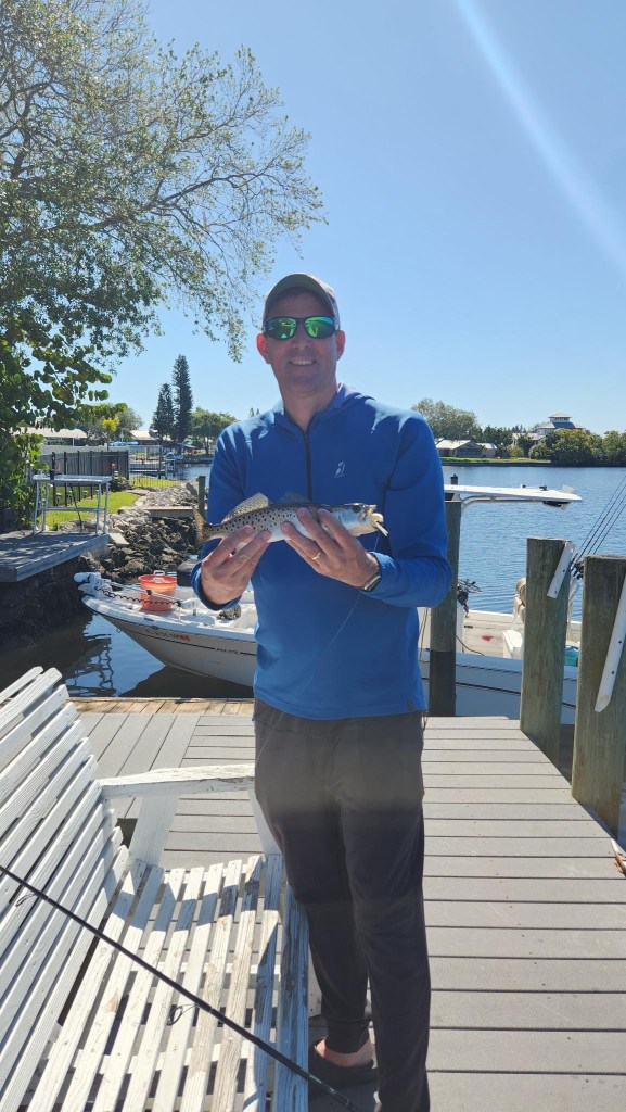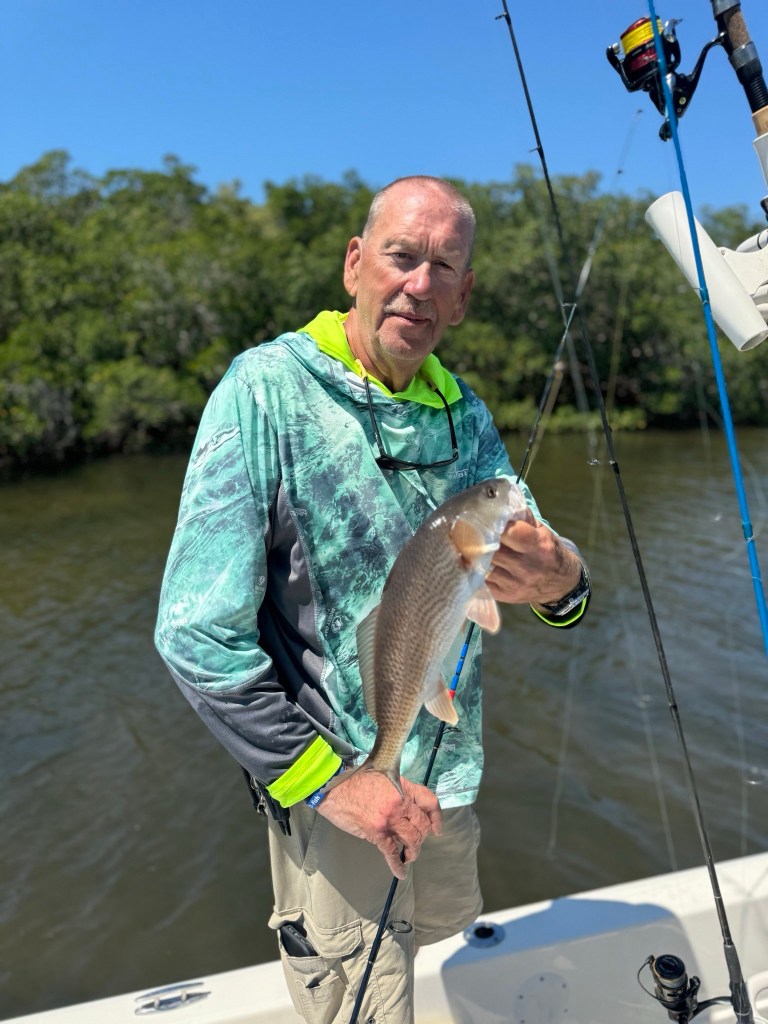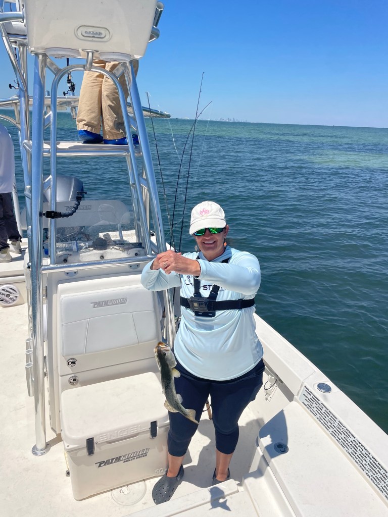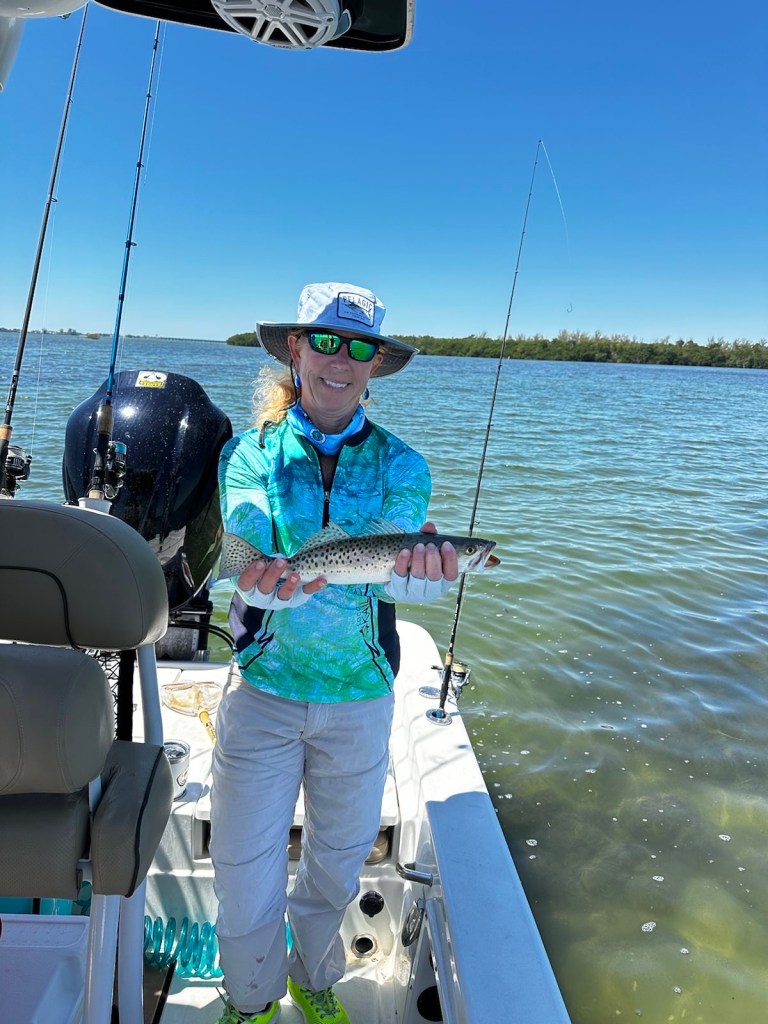 I retied a new 20lb leader on my main line and then switched to a slam shady 2.0 with a Owner Twistlock 3/0 hook as we finished working Crab Creek. Our next spot we worked was the shoreline of Dickman Isle. This is where we started to see life, and the bite started to pick up. In this area, Luke landed three trout ranging from 14 to 16 inches, a short snook, and a ladyfish. Cathy also caught a small Crocker, which we threw into the live well to use back at the dock later in the evening. Almost as quickly as the bite turned on, it turned off.