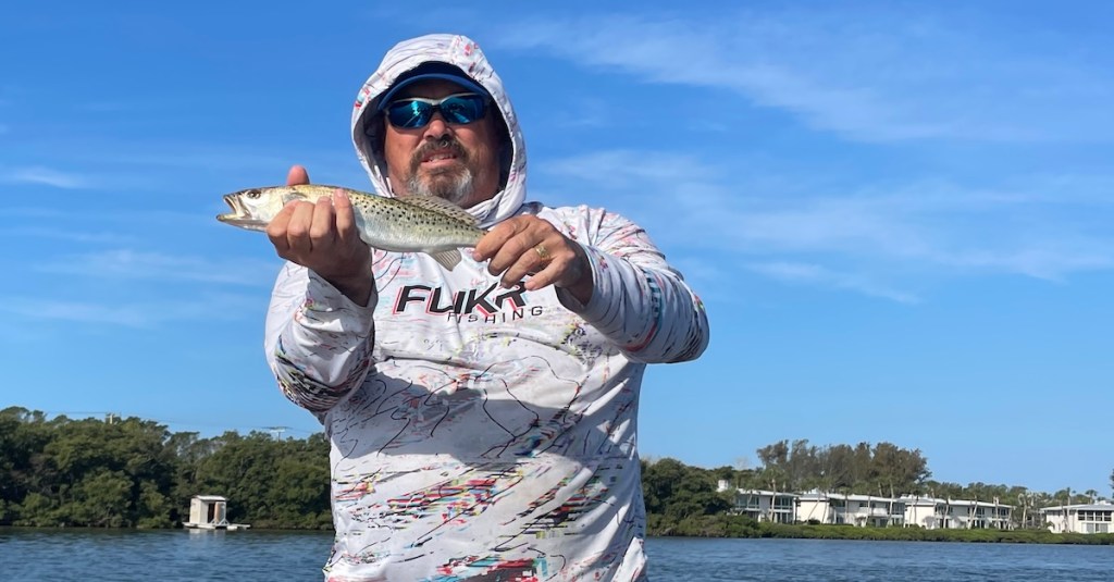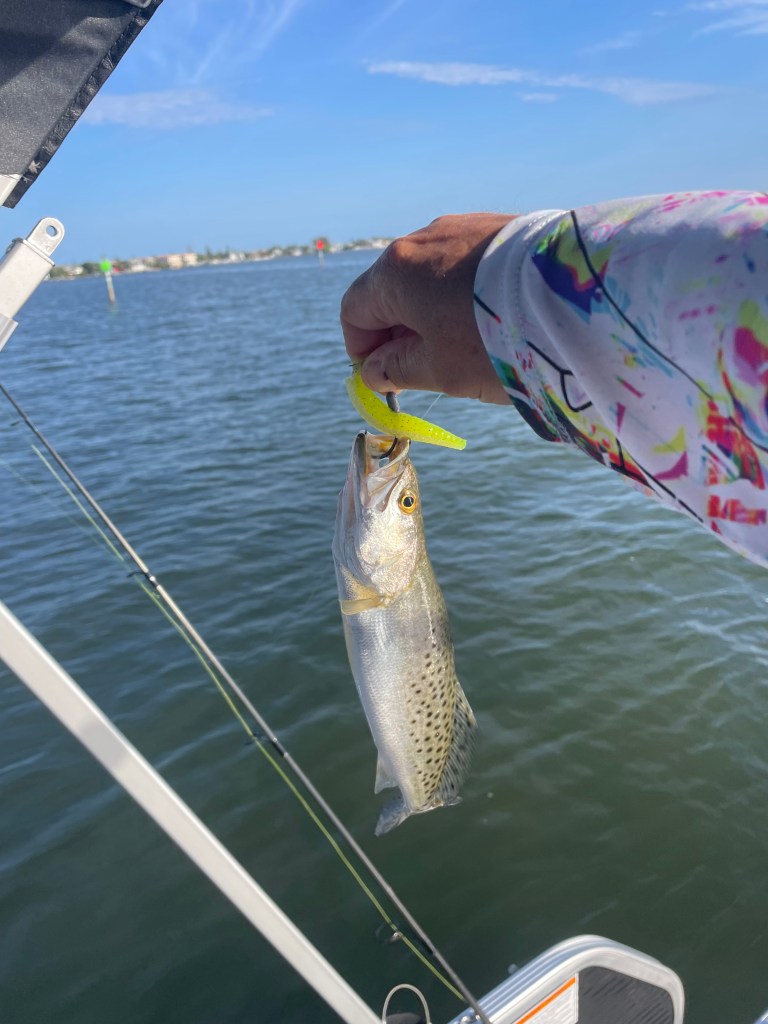 We started drifting northwest near the Kingfish boat ramp. We put a shrimp under a cork popper, and then Tania started with a Slam Shady 2.0 on a #3 1/8oz owner twist lock. I was using the Optimus lime mulligan. It didn’t take long for the puffer fish to take the tail off my bait, but I continued to throw it. About halfway through our drift, we lost several baits on the cork popper, and I finally landed the first trout. It was only about 10 inches long, but it was the targeted species.