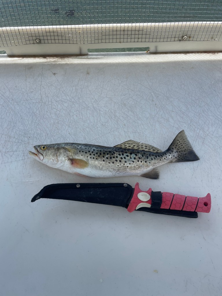 After the third drift, I decided to move since all the trout we caught were between 10 and 14 inches, and I wanted to bring one home. We started fishing again when I saw a ton of bait around us. We spent the rest of the morning drifting north through the bait. We caught lots of fish, mostly pinfish, but I did land a 16-inch trout to bring home, and Tania landed a small 10-inch trout.