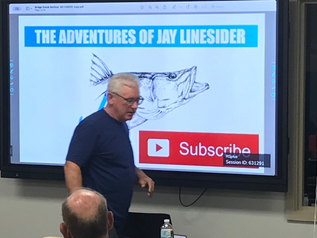 – Jayson delivered an engaging presentation on how to catch big snook at night under bridges.