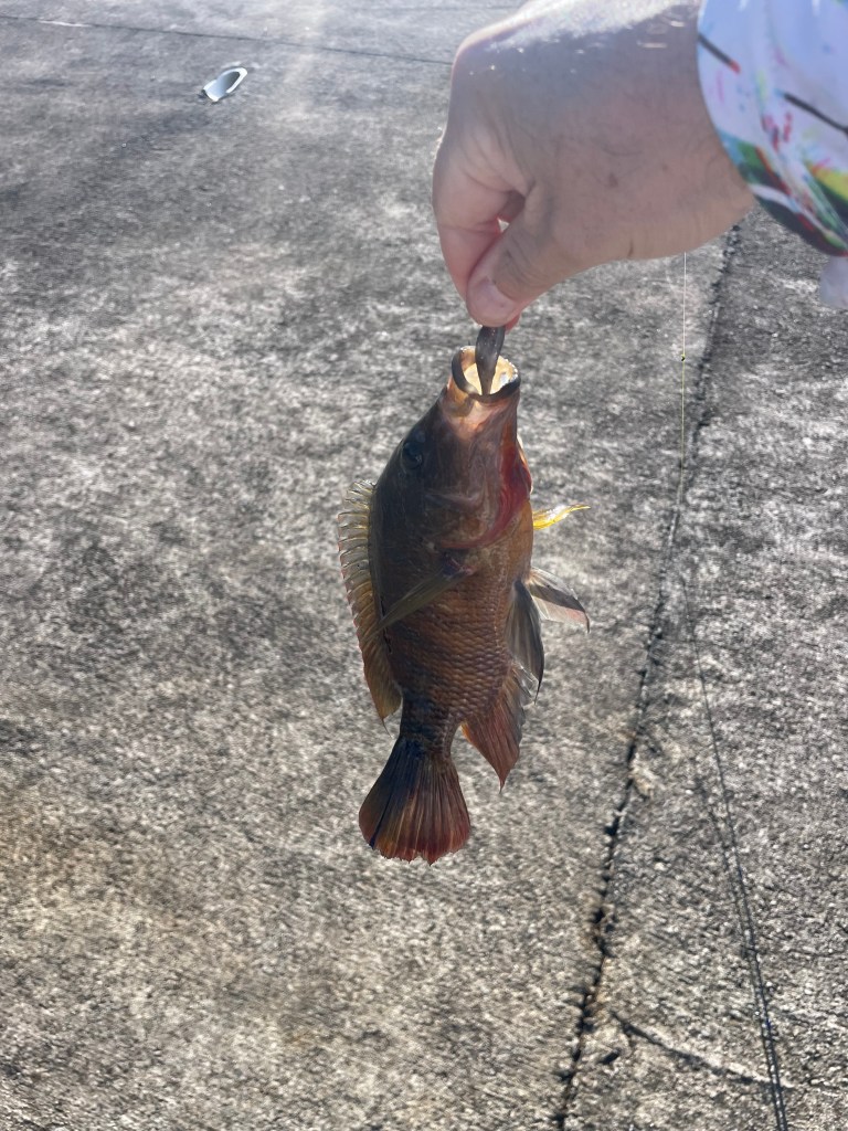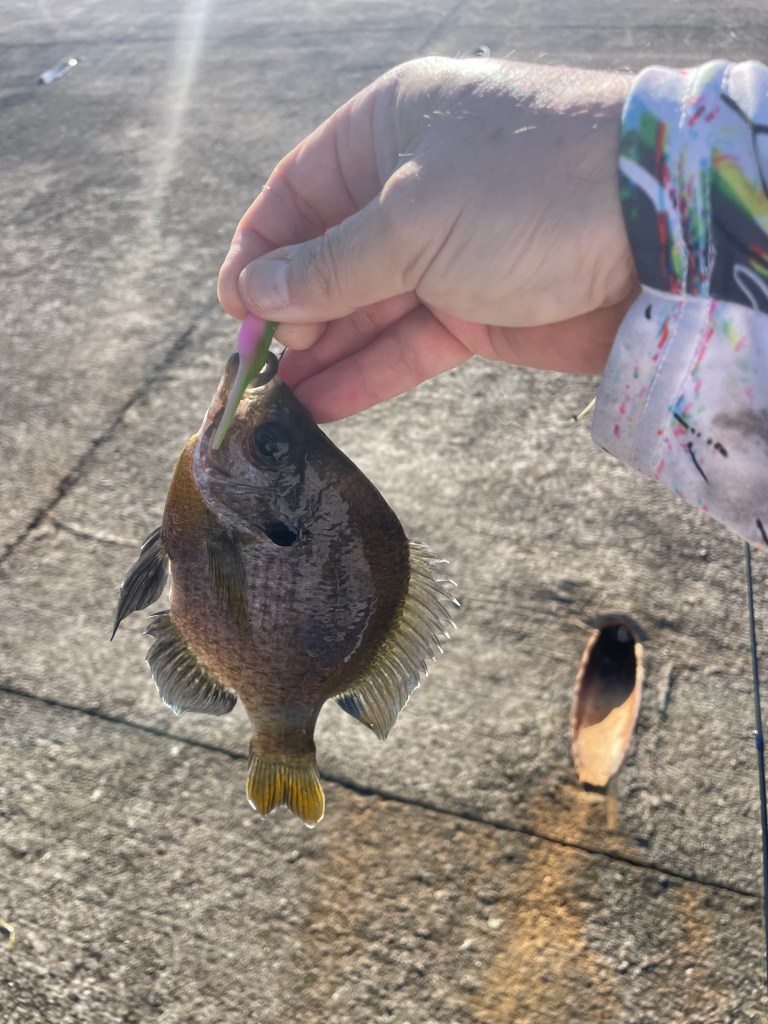 At the first spillway, I landed a bluegill and a Mayan cichlid. I caught the bluegill on a 1/32 jig head paired with a Crappie Maxx Baby Shad in the electric chicken color. Meanwhile, the Mayan cichlid hit on the same lure but in the threadfin shad color. I also tested the chartreuse and Cajun critter white variations, but they didn’t get much attention, so I stuck with what worked.