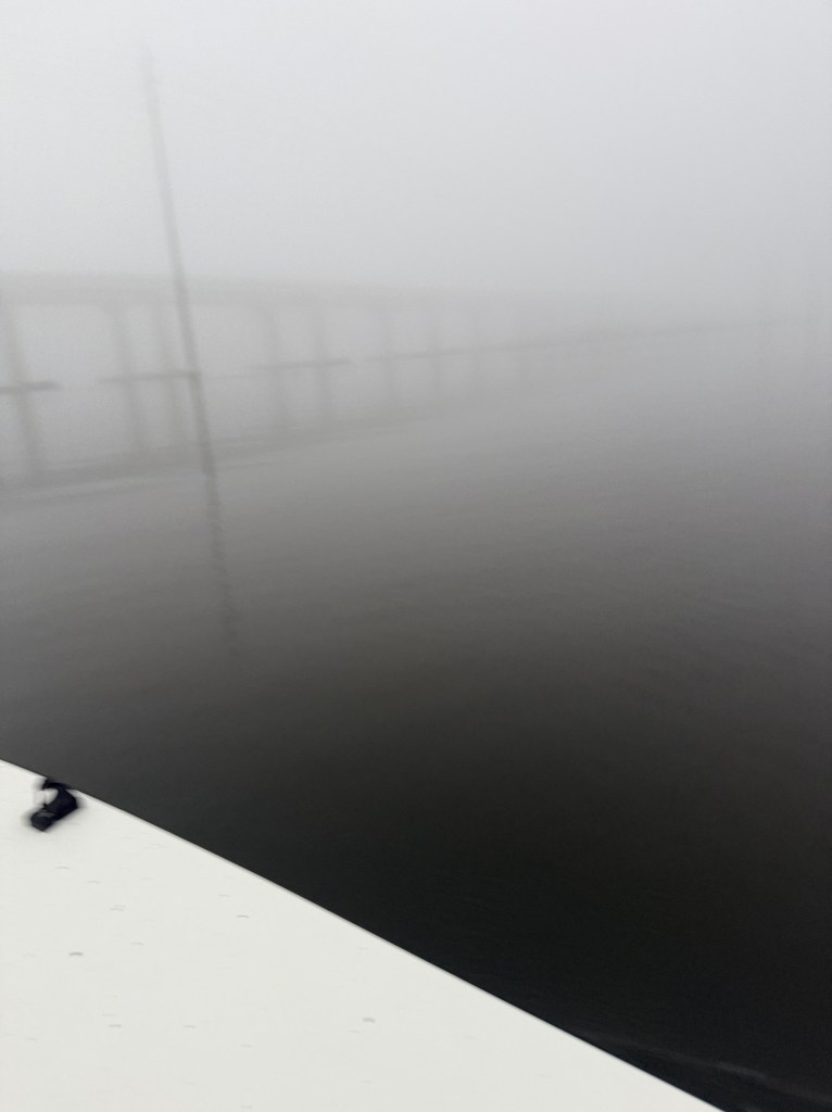 As we left the dock, a layer of fog appeared in the distance, but within minutes of heading south, we were entirely engulfed. Visibility dropped to about 15 feet, creating an eerie atmosphere. Thanks to modern GPS and mapping technology, we felt secure navigating through it, yet it was still an intense ride. About 10 minutes into the journey, Captain Isaiah reminded me that we had forgotten to start the day with a prayer, so I offered one as we continued toward our first fishing spot.